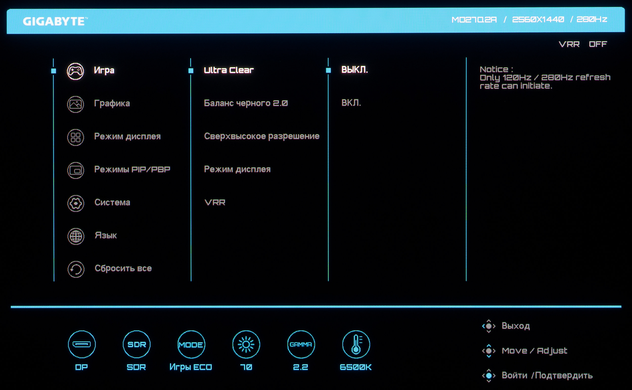 Блок с игровыми настройками открывает доступ к ключевым функциям, связанным с поведением дисплея в динамичных сценариях. Именно здесь активируется Ultra Clear — система вставки чёрного кадра, работающая только при 120 и 280 Гц, без промежуточных режимов. Тут же располагается Black Equalizer 2.0, позволяющий лучше различать детали в затемнённых областях кадра, включается Super Resolution, выбирается формат работы встроенного скалера через Display Mode и активируется поддержка VRR.