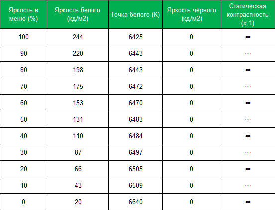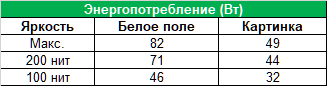 Отдельно была проведена проверка энергопотребления при разных значениях яркости. Измерения выполнялись как на полностью белом поле, так и при выводе обычного тестового цветного изображения на весь экран.
