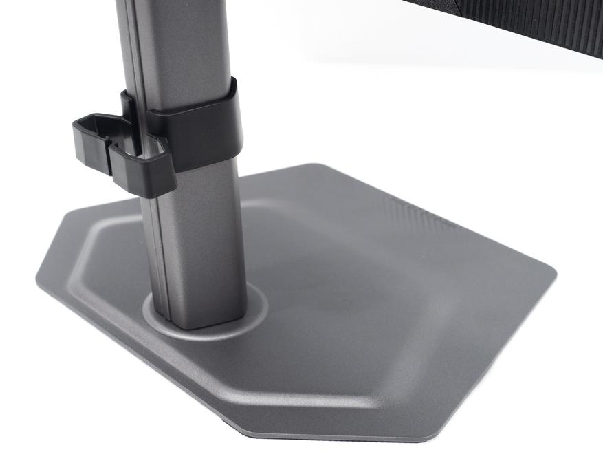Основание выполнено полностью из металла и в обычных сценариях хорошо удерживает монитор на месте. Конструкция ощущается надёжной и рассчитанной на долгую эксплуатацию. Правда, полной изоляции от внешних воздействий нет: при активной печати на клавиатуре часть вибраций со стола всё же может передаваться на экран. Для тех, кто много работает с текстом и постоянно смотрит в монитор, такой нюанс иногда оказывается заметным.
