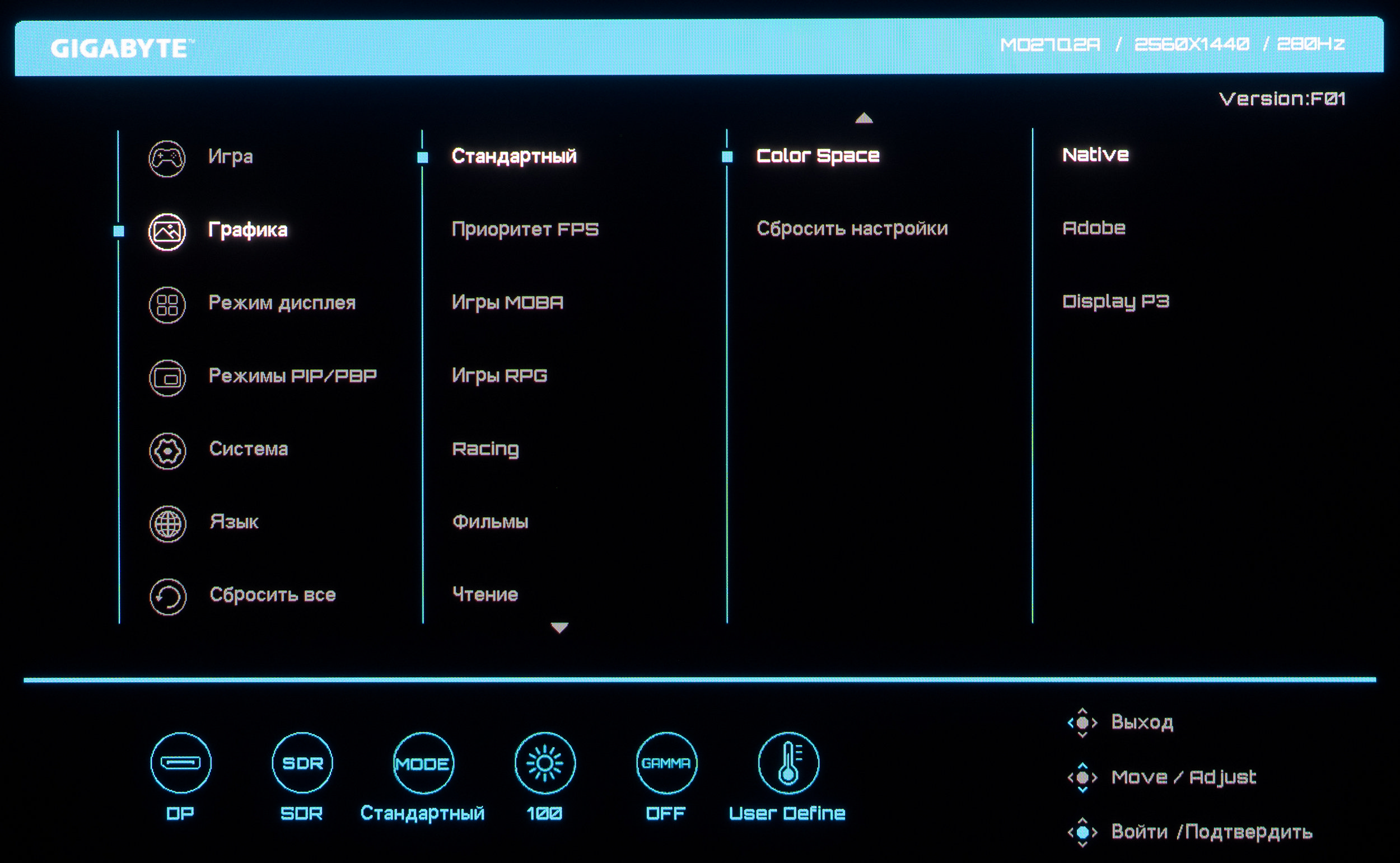 В ряде пресетов можно вручную выбрать нужное цветовое пространство, например Display P3 или AdobeRGB. Для sRGB выделен отдельный режим эмуляции. Во всех подобных вариантах монитор сужает исходный охват программно, подстраивая отображение под выбранный эталон. Делается это за счёт корректировки цветовых компонент, чтобы картинка меньше выходила за пределы целевого стандарта.