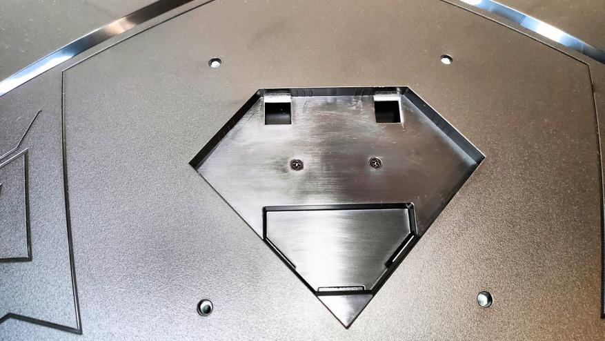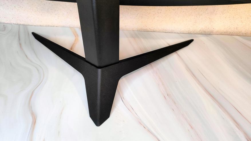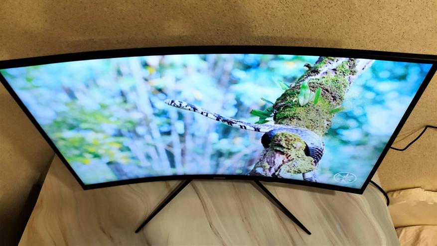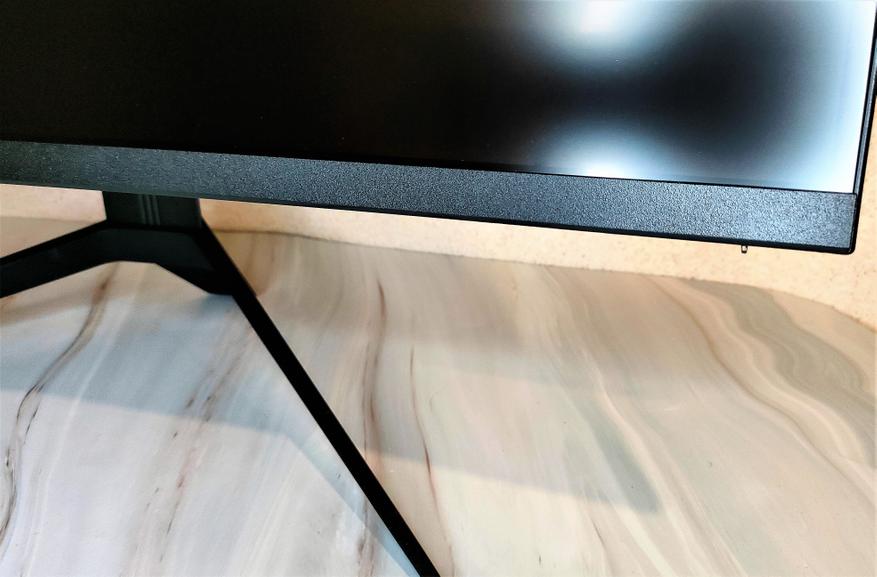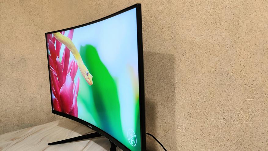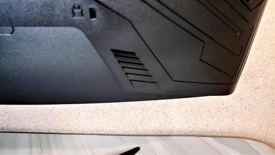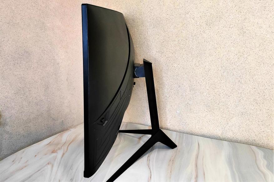 Если заглянуть сверху вниз, сразу в глаза бросается искривление дисплея с заявленным радиусом изгиба 500R. Особенно это бросается в глаза при просмотре сбоку. Комплектная подножка устанавливается ближе к центру тыловой стороны корпуса монитора и имеет 3 точки упора.