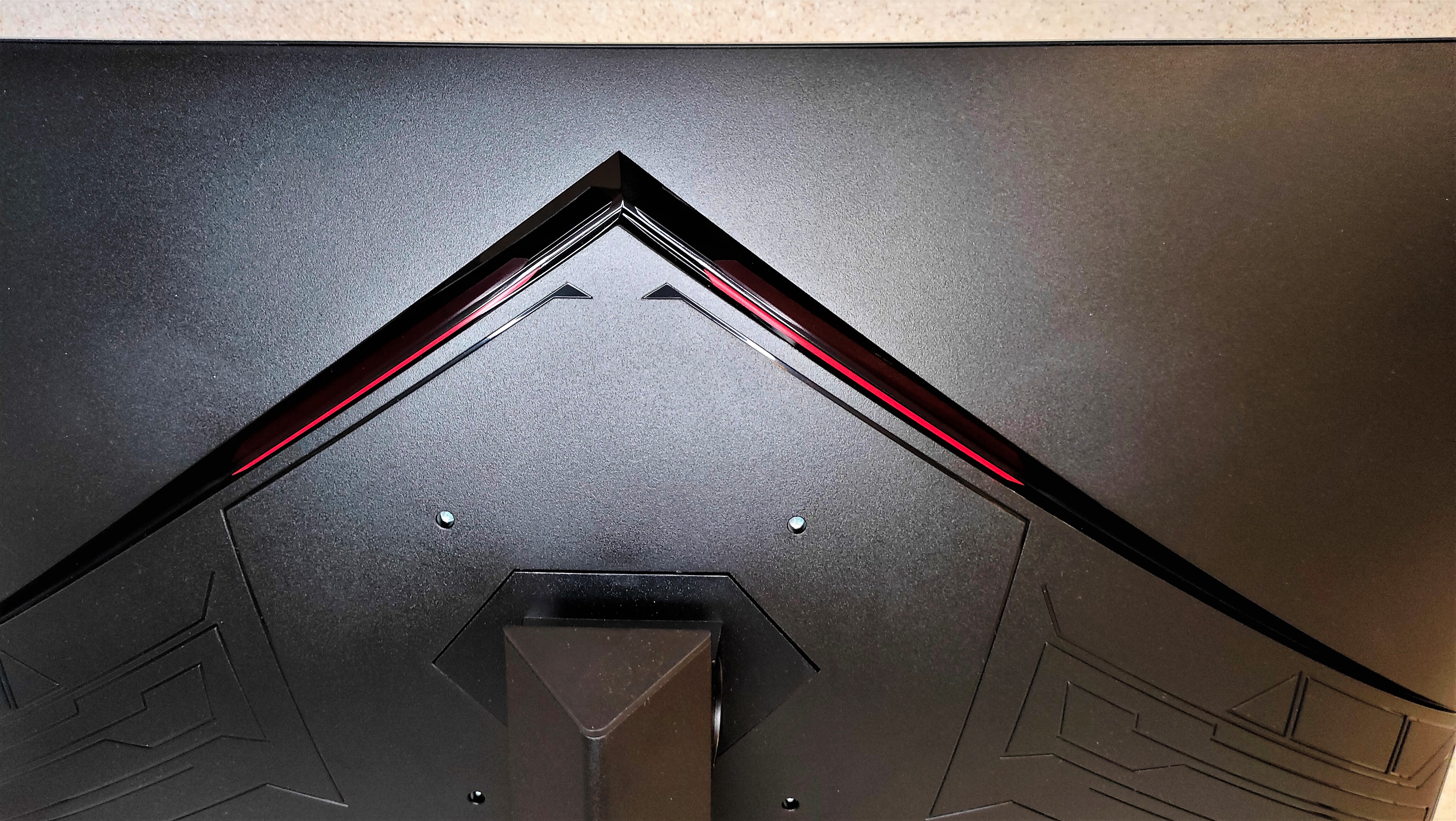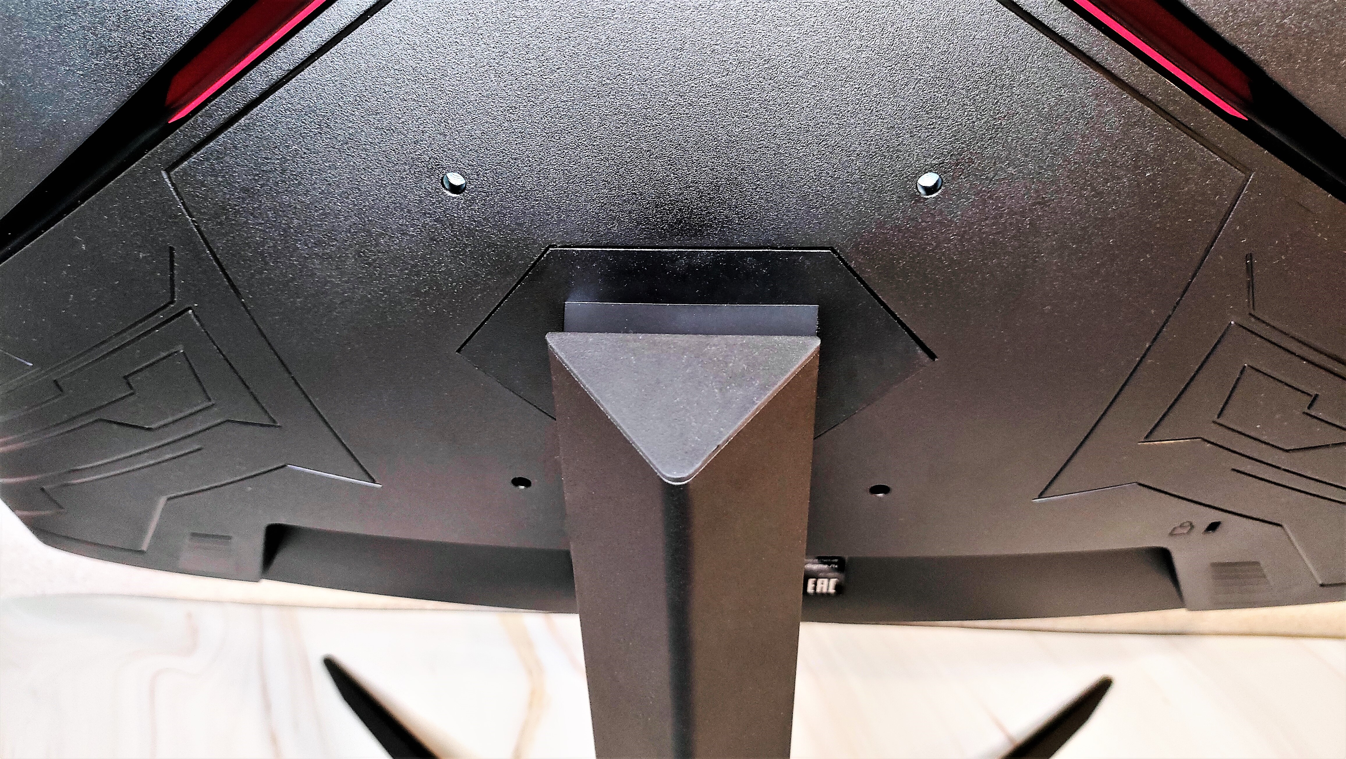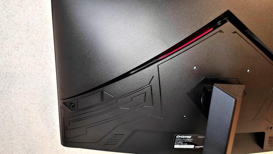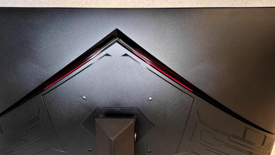 Обратная сторона монитора украшена в игровой стилистике. Есть две дизайнерские вставки в прорезях из красного пластика. Это однозначно добавляют изюминки во внешность монитора, выгодно отличая от одноклассников. Единственное, жалко, что красота располагается всегда «лицом от нас».