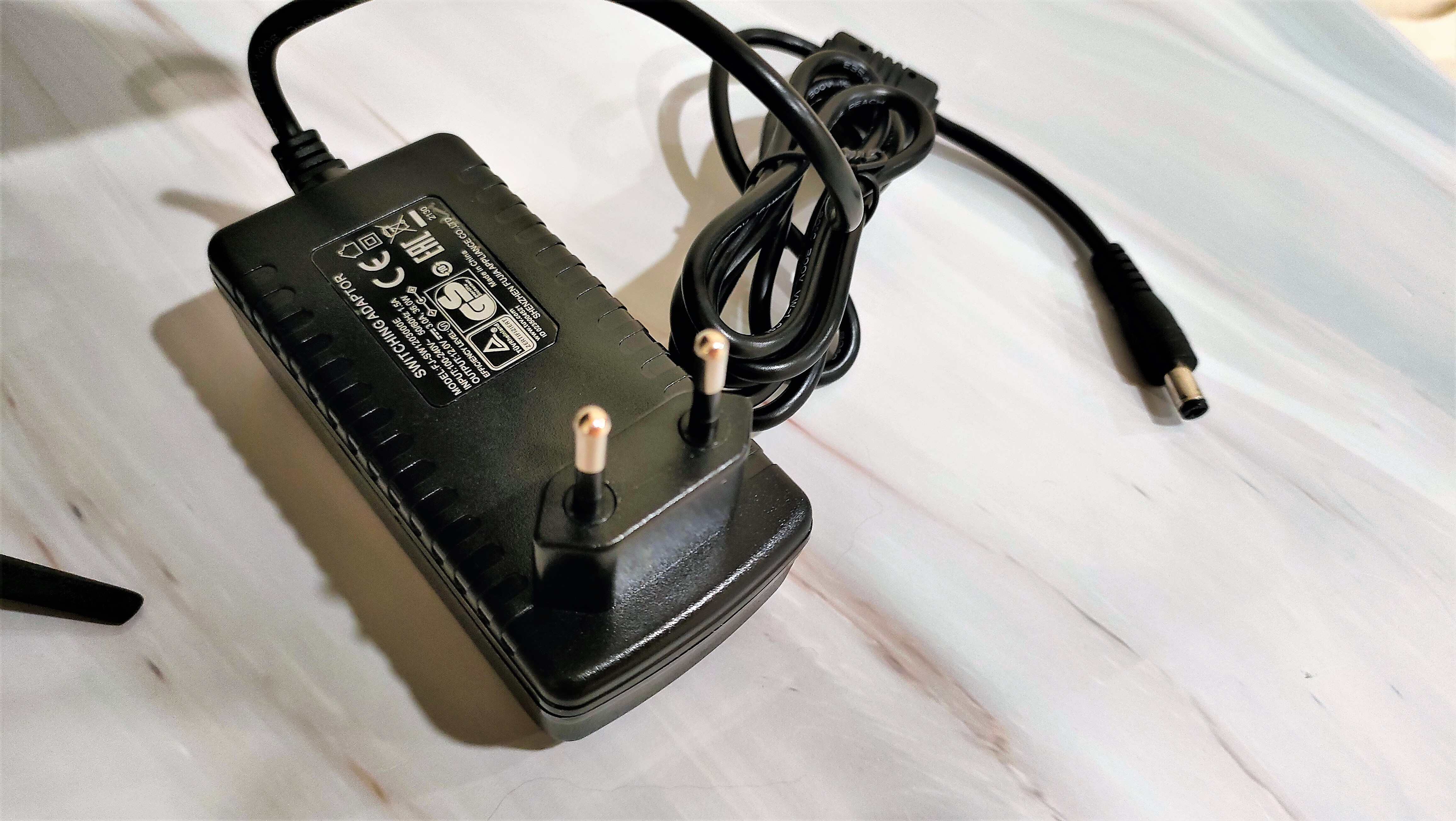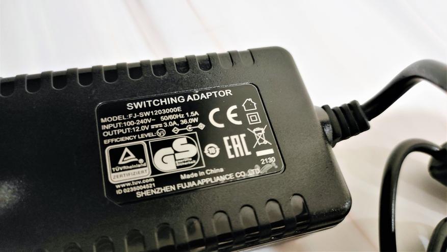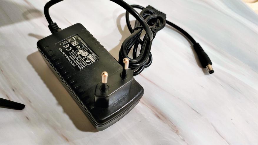 Комплектный блок питания выполнен в удобном корпусе, который сразу вставляется в розетку. Параметры по питанию 12V 3A на 36Вт. Длина кабеля 1м, разъем с другой стороны кабеля стандартный 5мм.