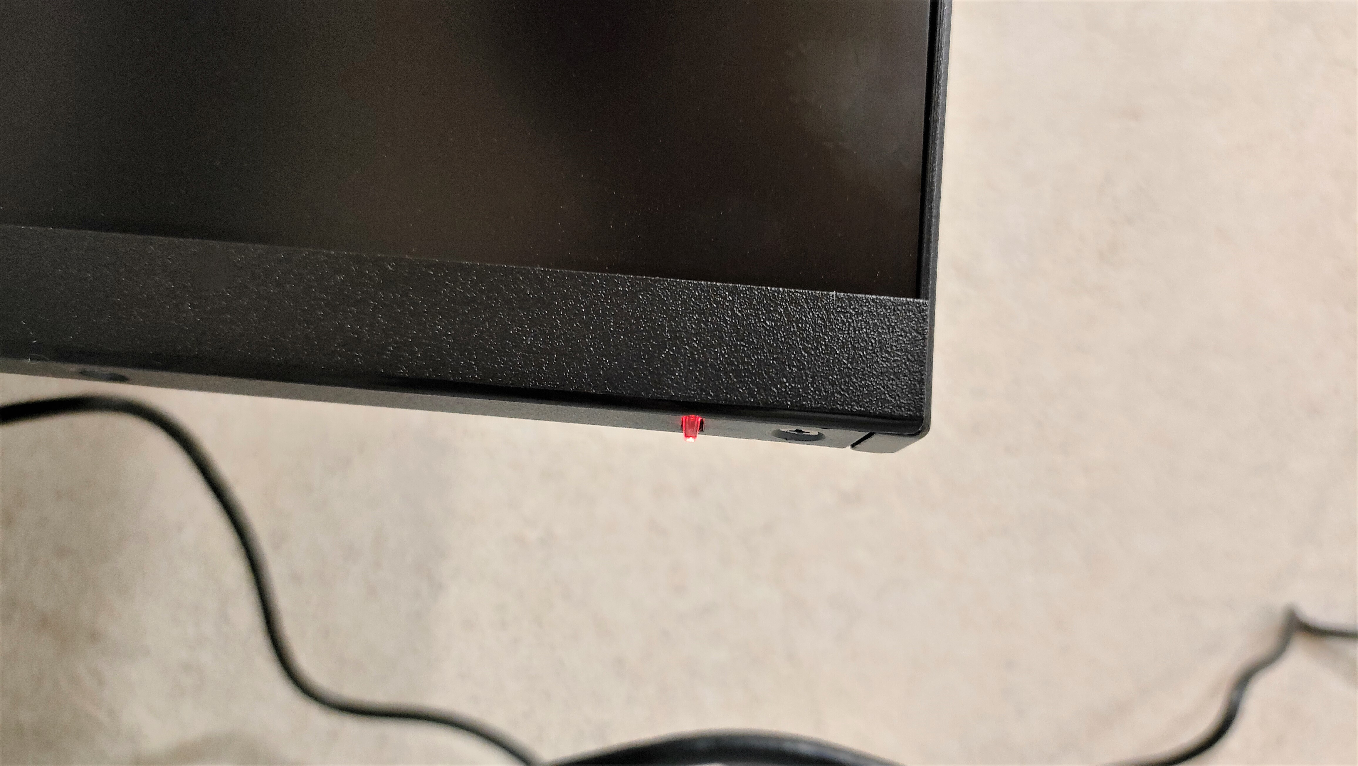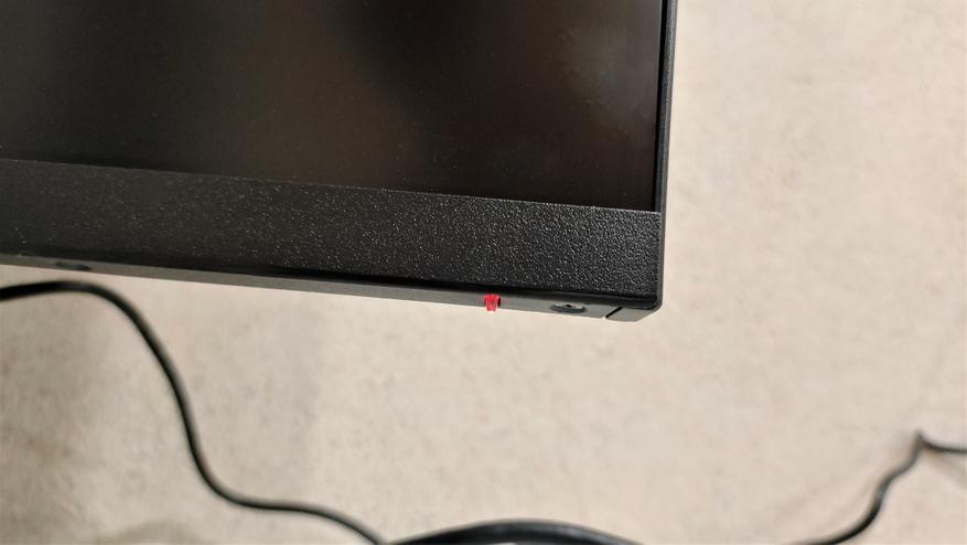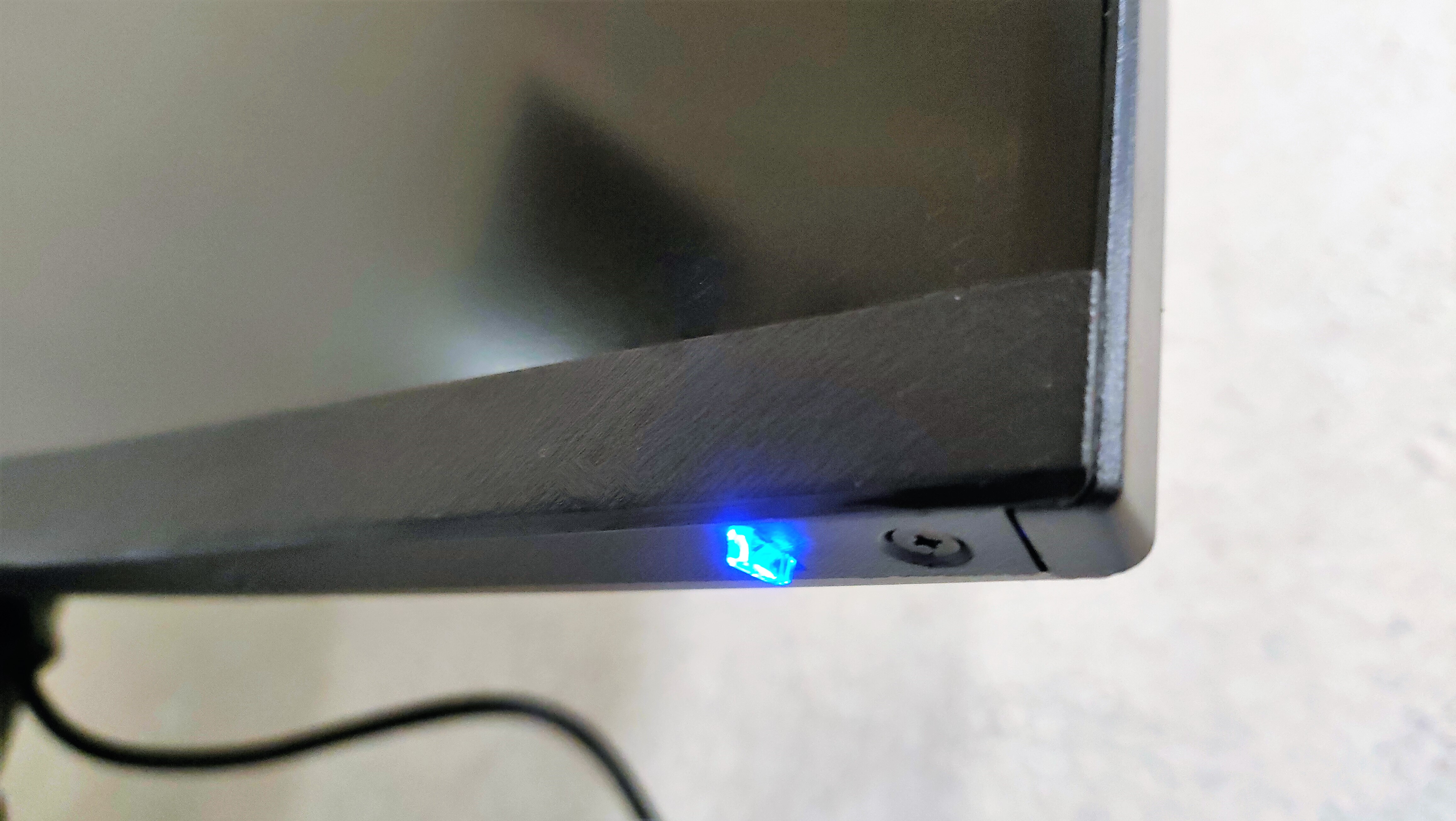 Для начала подключаем монитор к сети. И сразу замечаем подсвеченный светодиодный индикатор состояния монитора с нижней грани монитора с правого края. Он имеет 2 состояния: Вкл- синий, режим ожидания — красный.