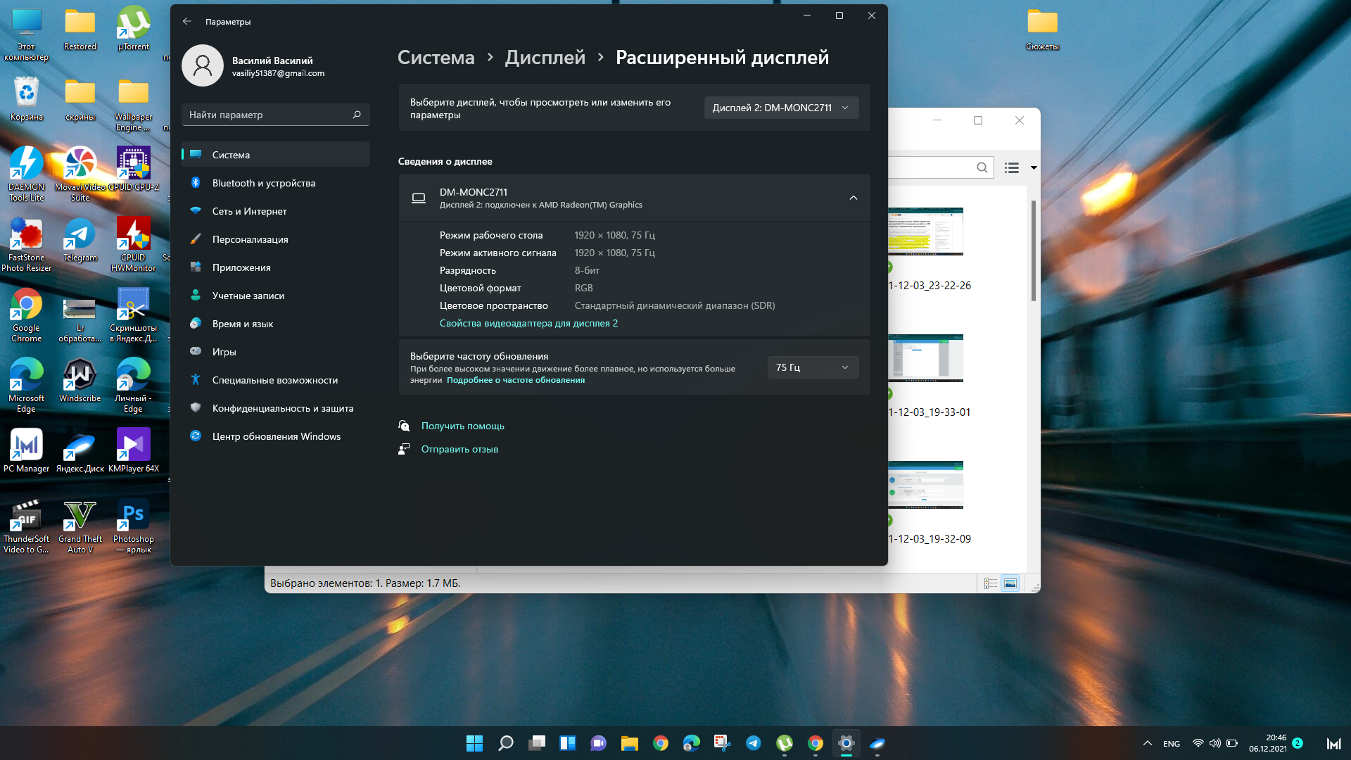 Посмотрим настройки монитора. Видим честное разрешение 1920х1080 и 75 Гц частота