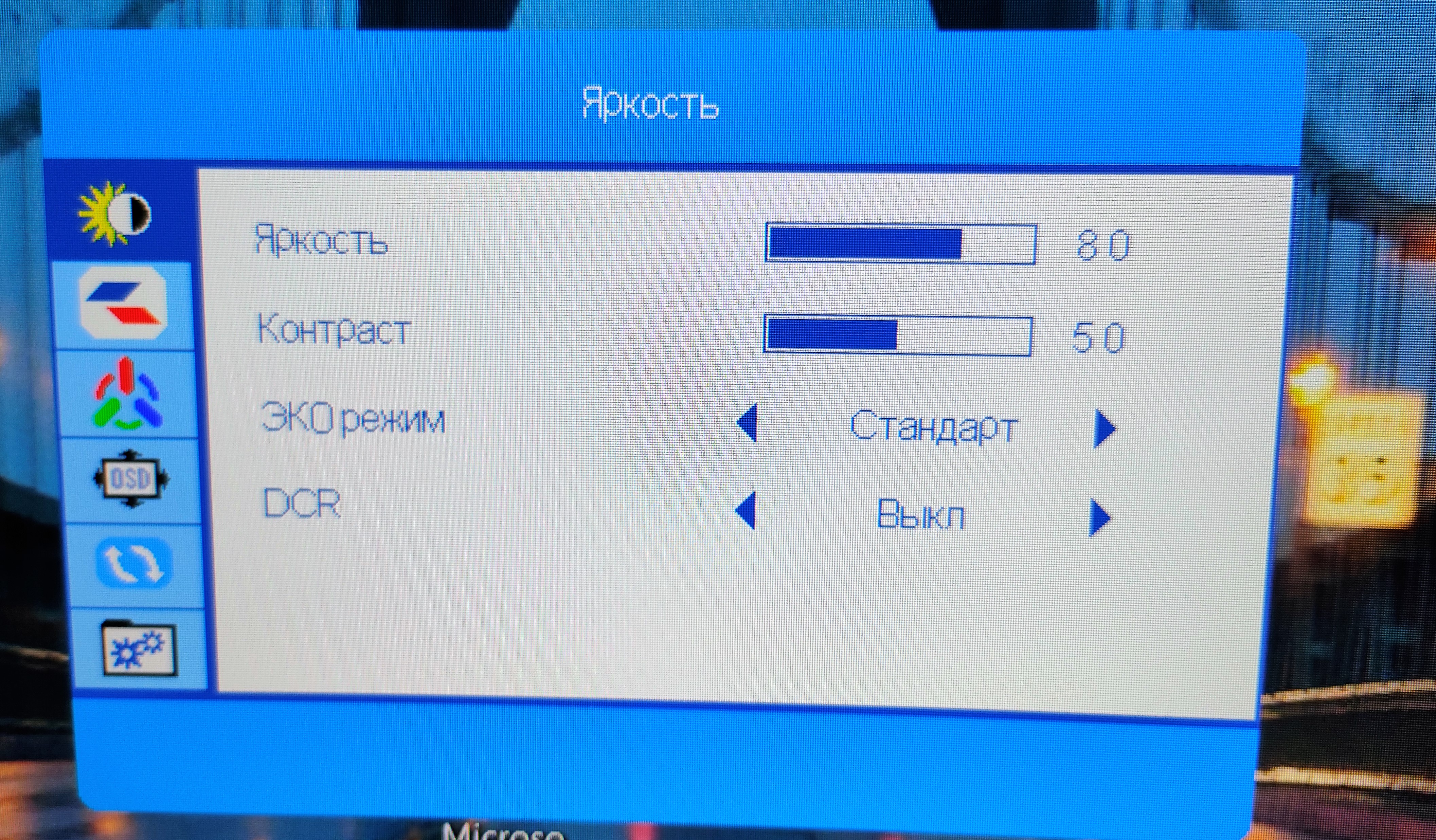 - Яркость, контрастность, включаем ЭКО режим и DCR;