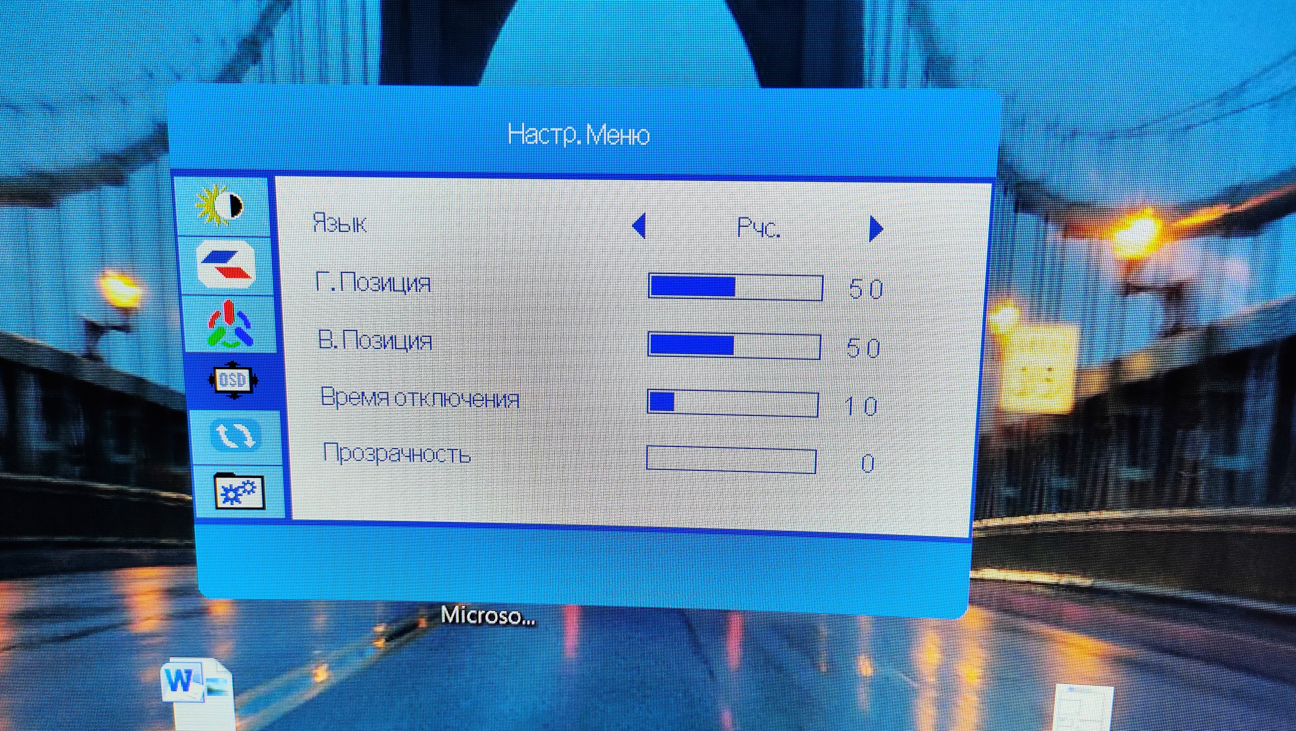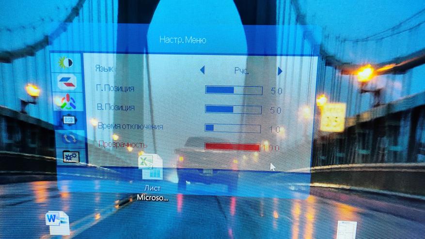 - Язык, Время отключения, прозрачность самого окна настроек;