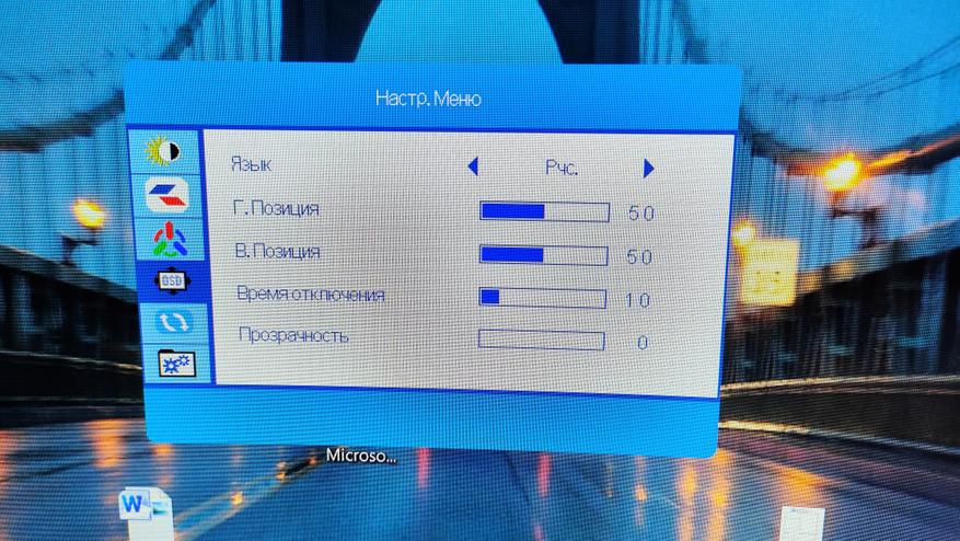 Для того, чтобы настроить монитор, воспользуемся джойстиком. Передвигаясь по пунктам меню, настраиваем: