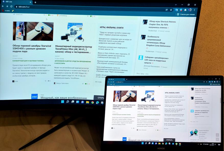 Единственное нарекание, это недостаточно яркий дисплей. Я привык к ярким дисплеям, и по началу приходилось привыкать. Конечно глаза устают меньше, но ярче просто привычнее. Вот для сравнения, как это выглядит рядом с экраном ноутбука Honor MagicBook с максимальной яркостью 450 кд/м2.