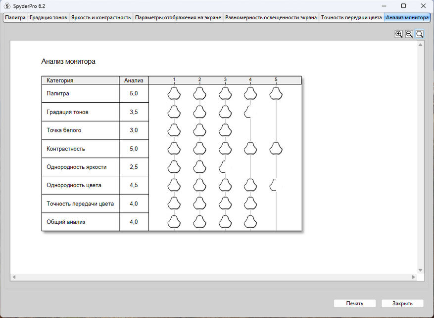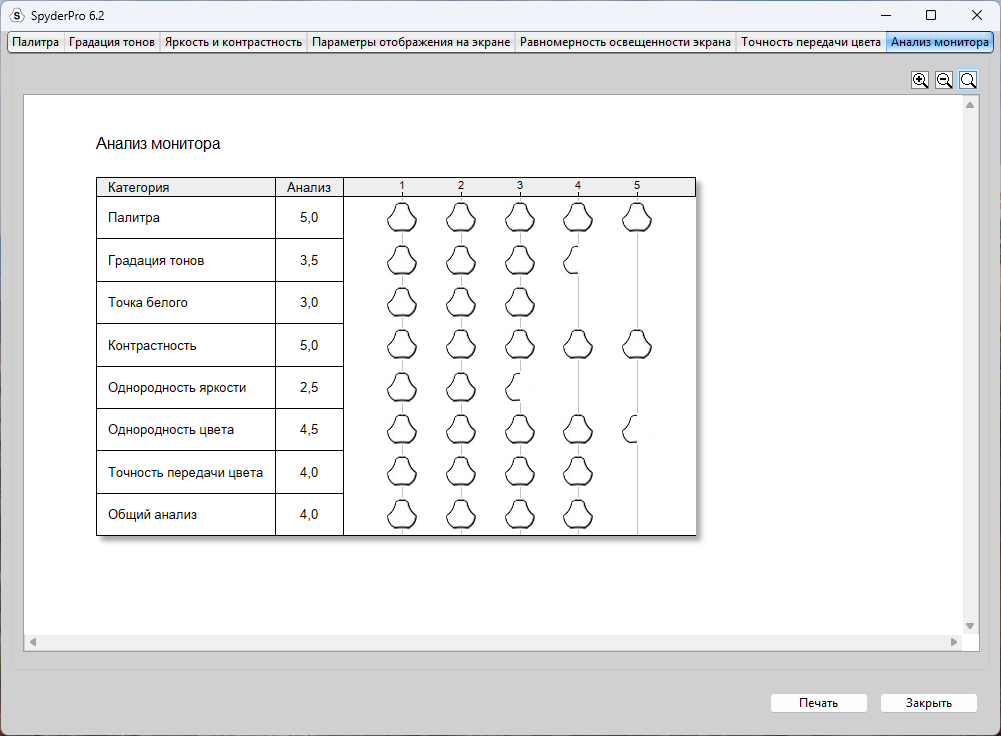 Все проведенные тесты сведены программой в таблицу ниже и каждому из них присвоена оценка из максимальных 5.0 баллов. Монитор Digma Overdrive 23,8″ получил в тестах 4,0 балла.
