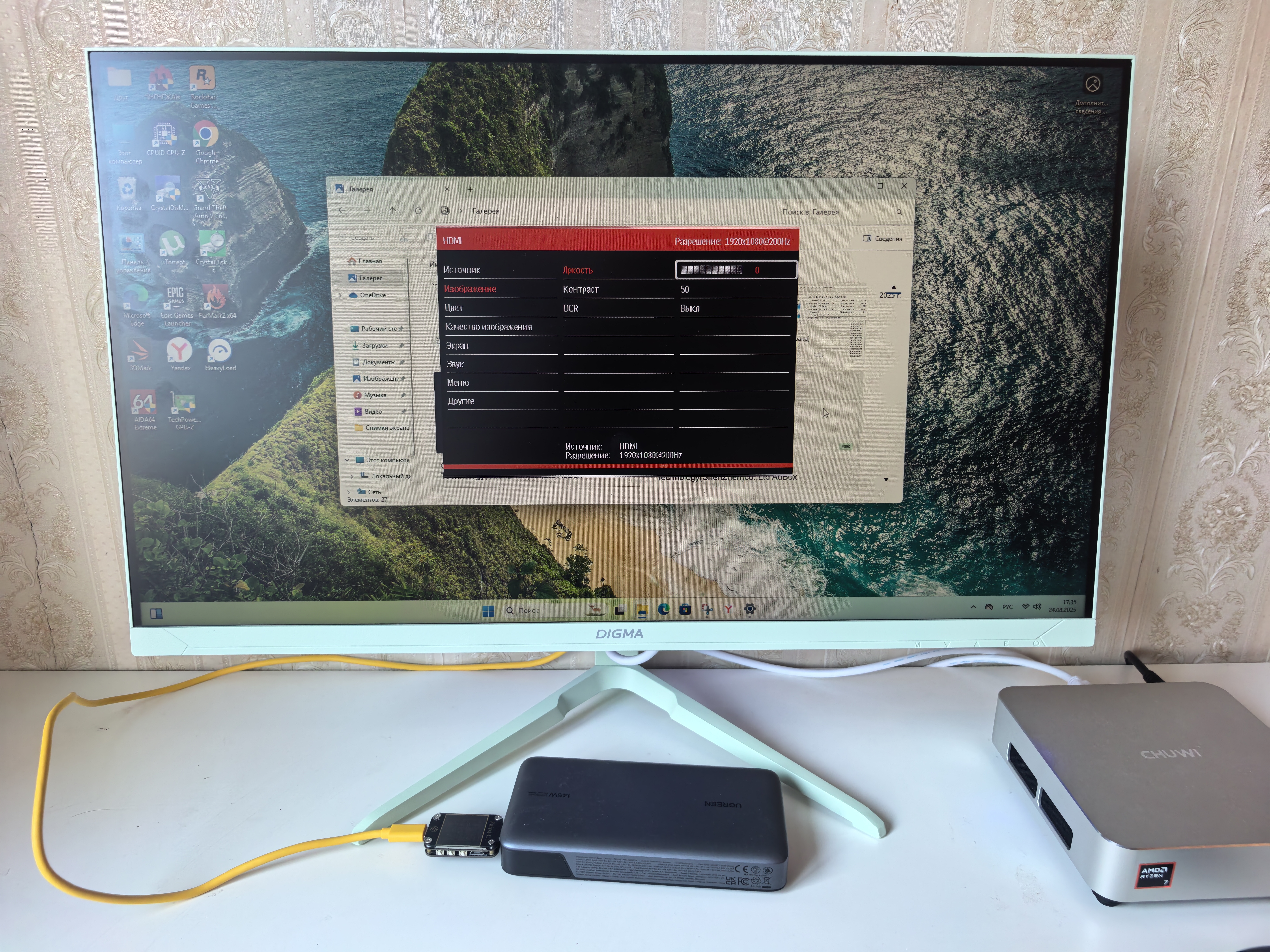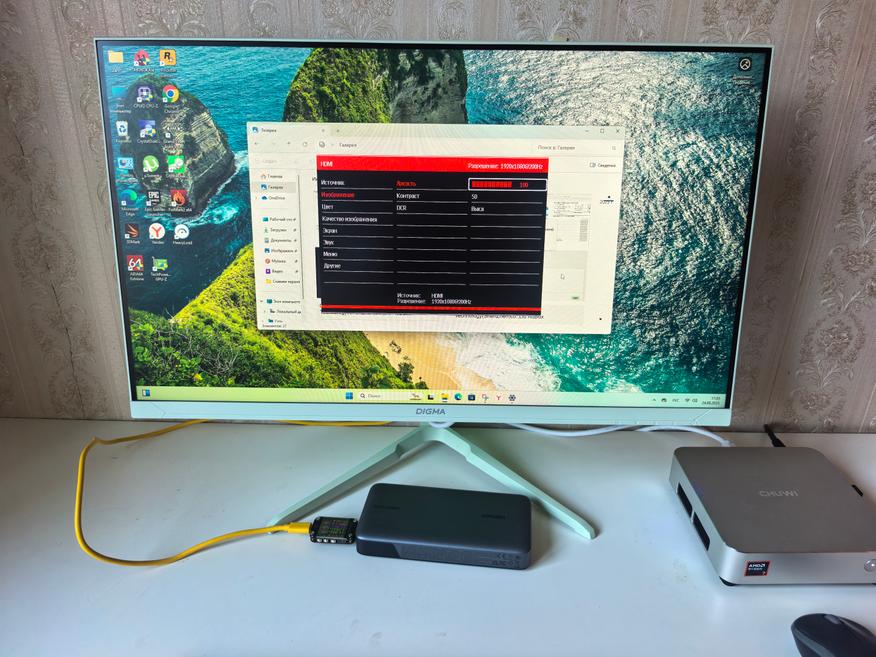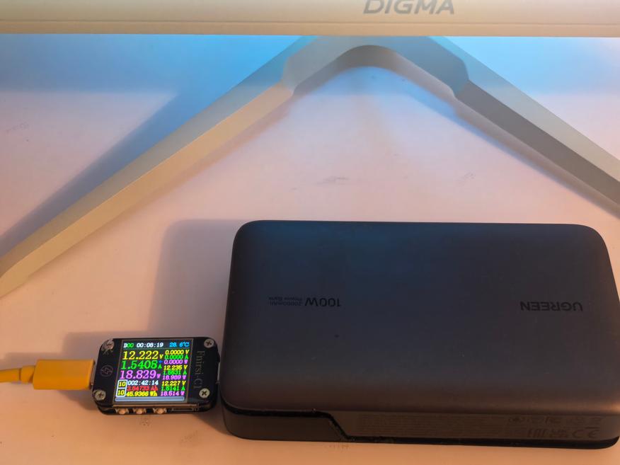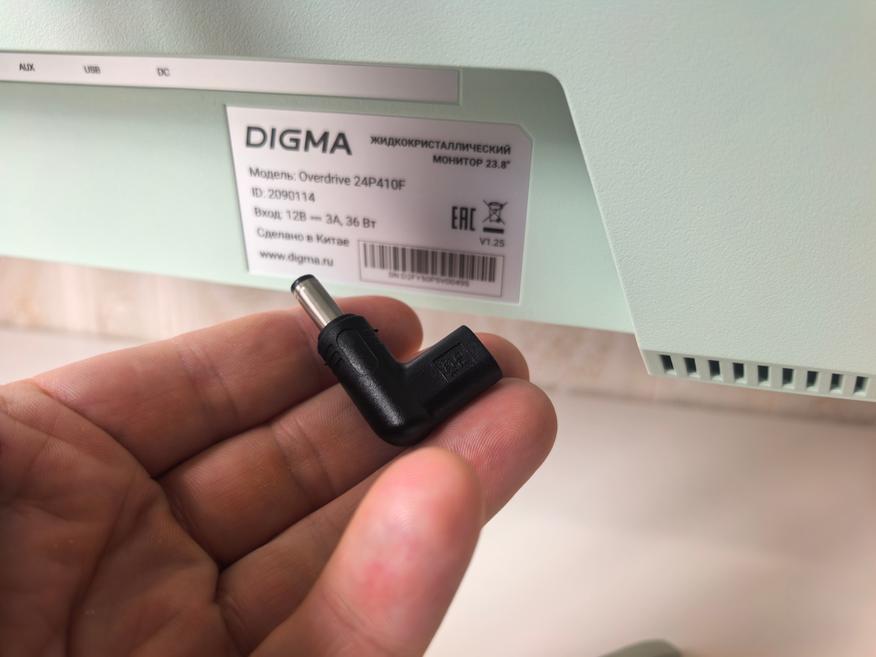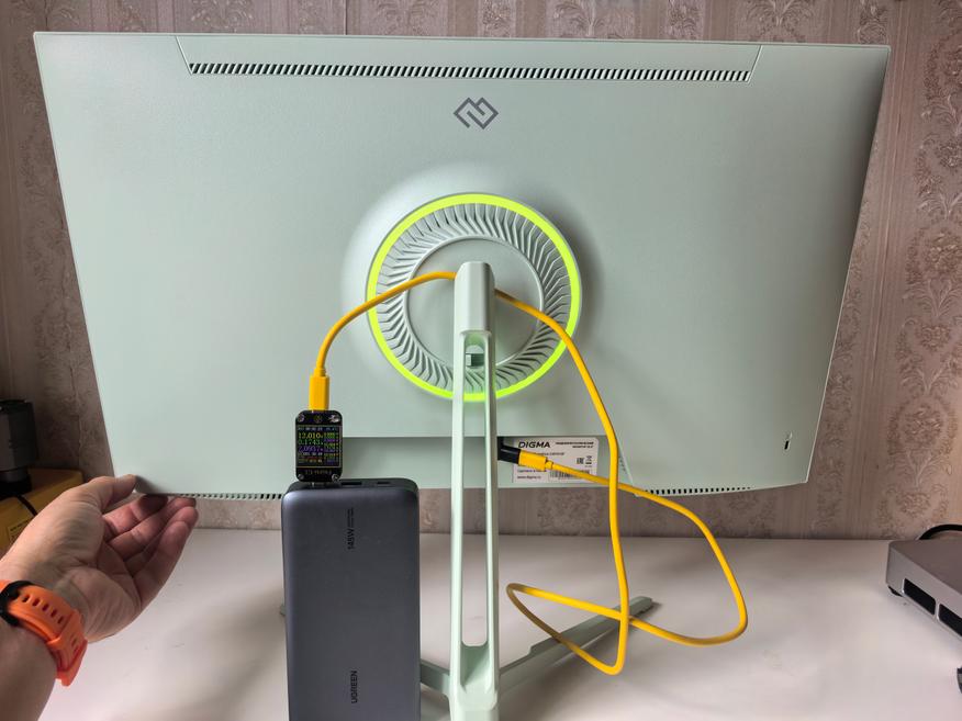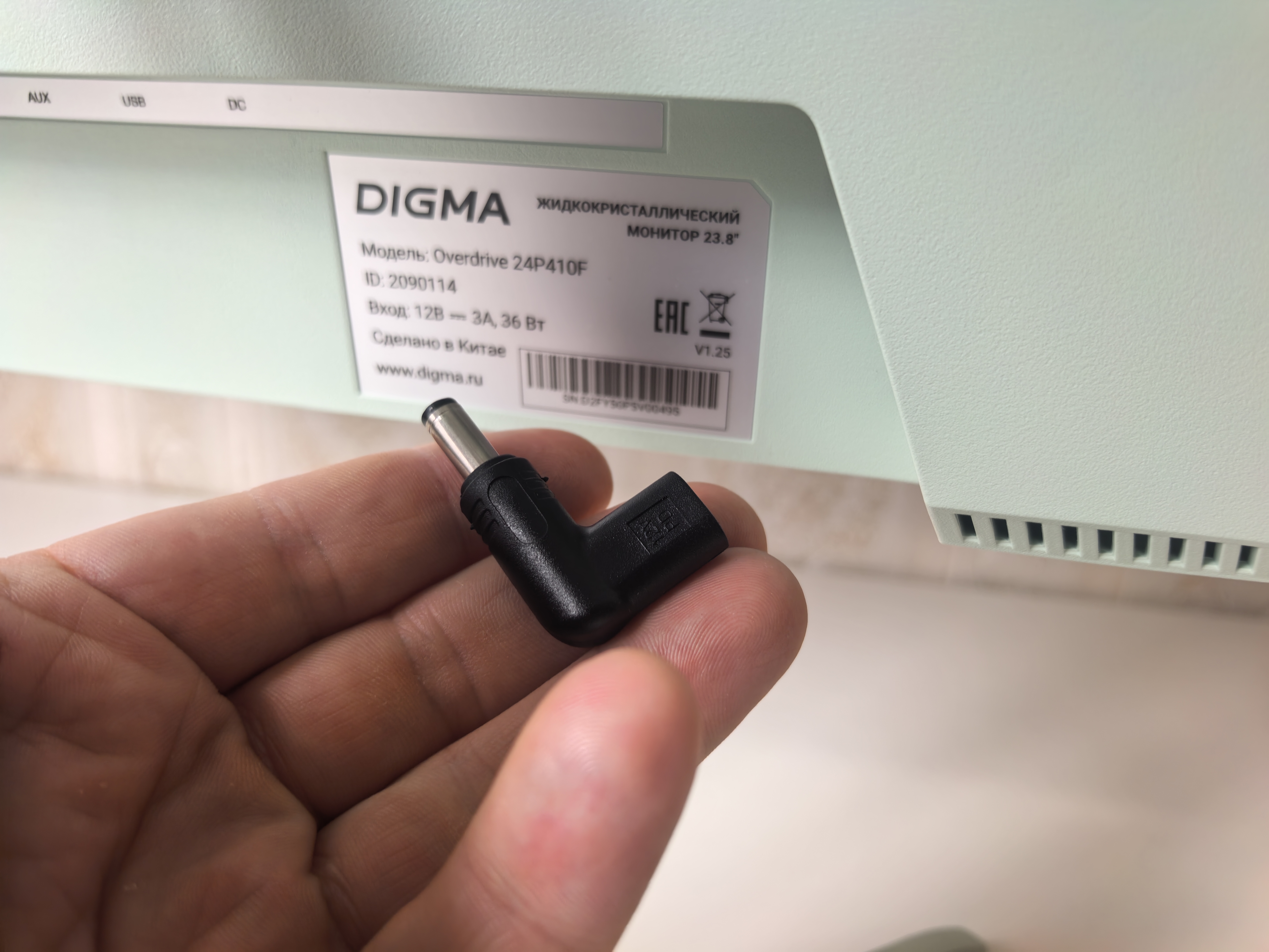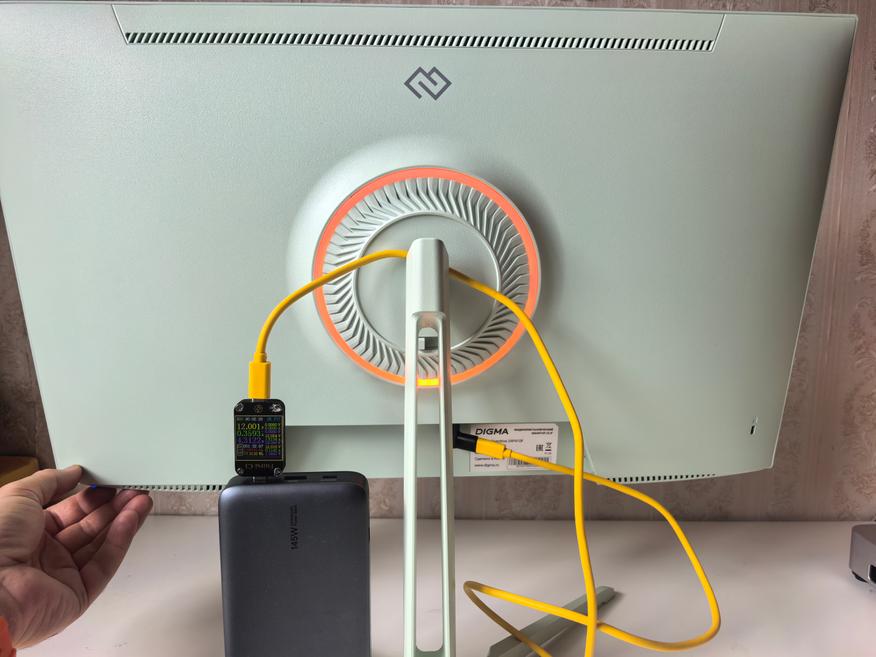 На фотографиях ниже показал работу подсветки и питание монитора от внешнего аккумулятора. Напряжение в 12В есть в большинстве повербанков. Если надо будет подключить через переходник Digma Overdrive 23,8″ к ним, проблем не будет. Главное, иметь соответствующий PD/DC-триггер на 12В.