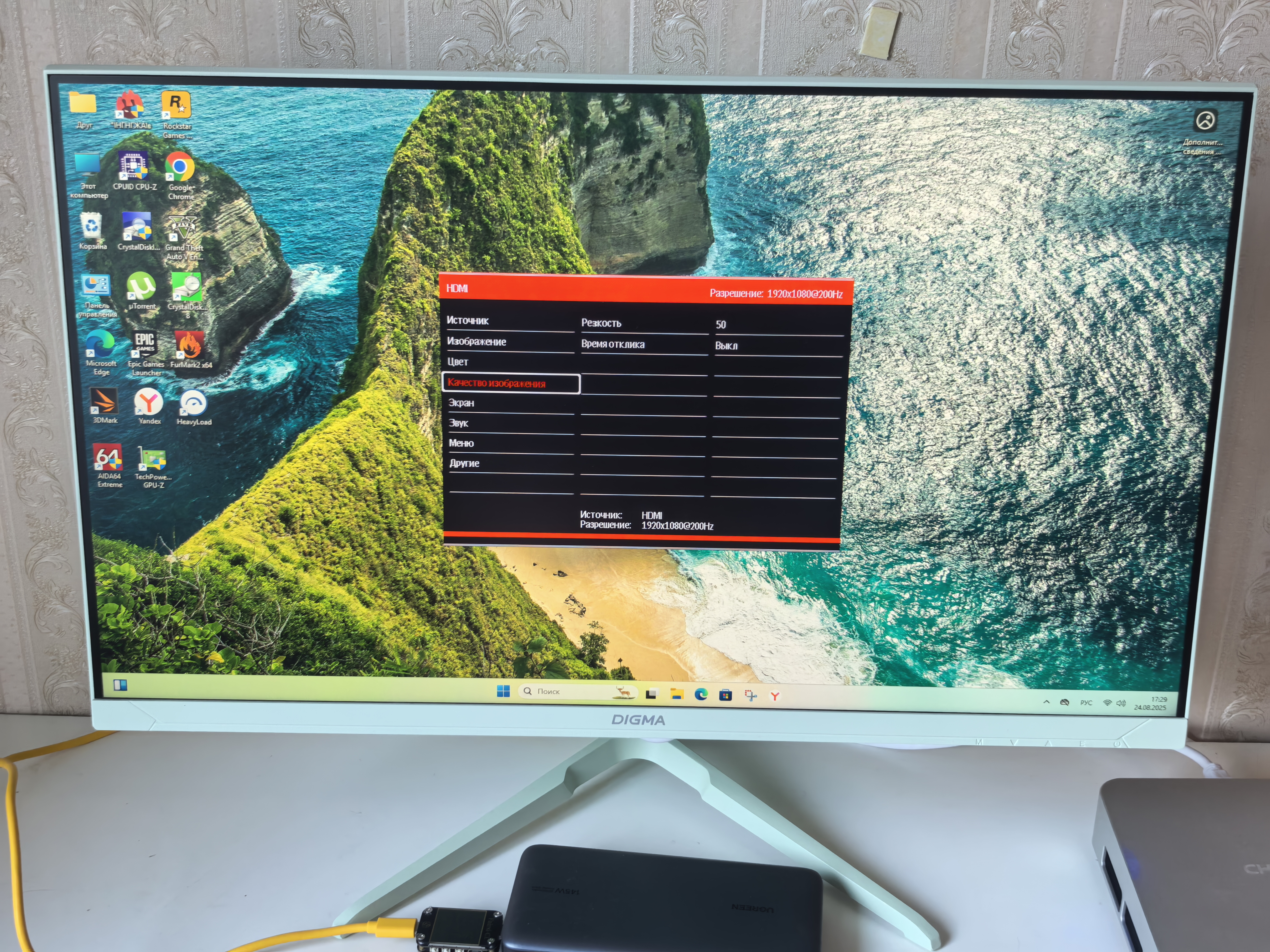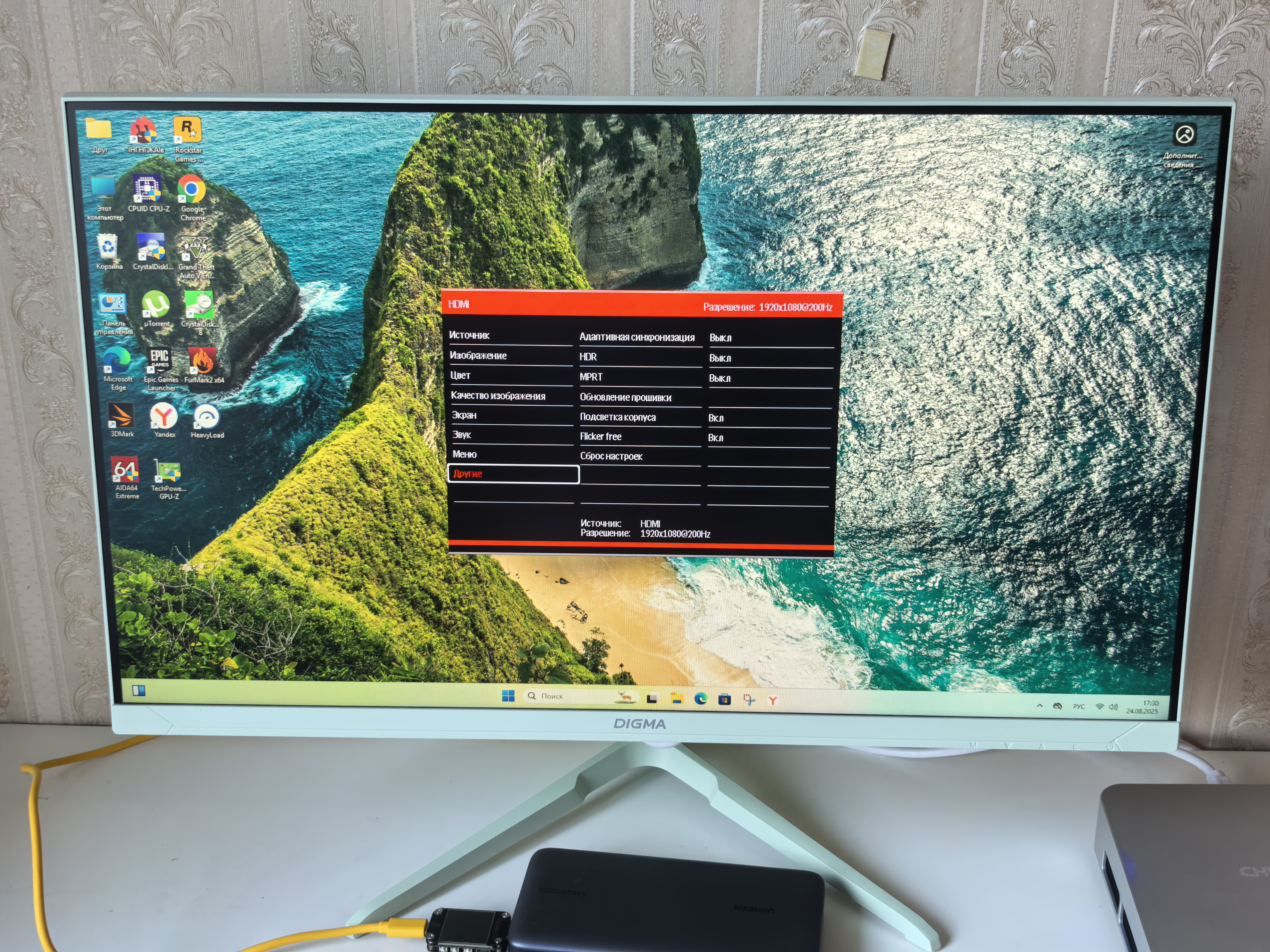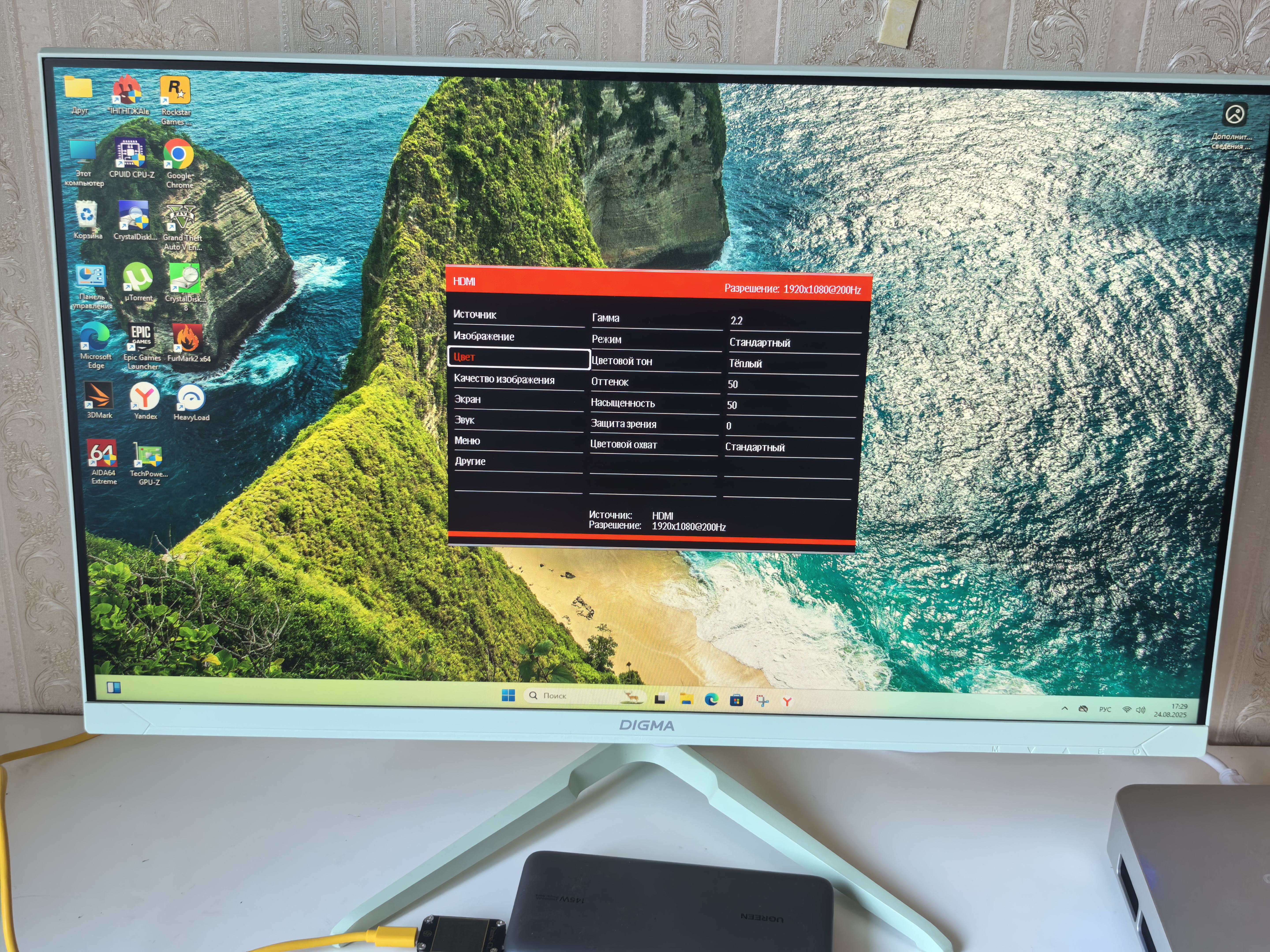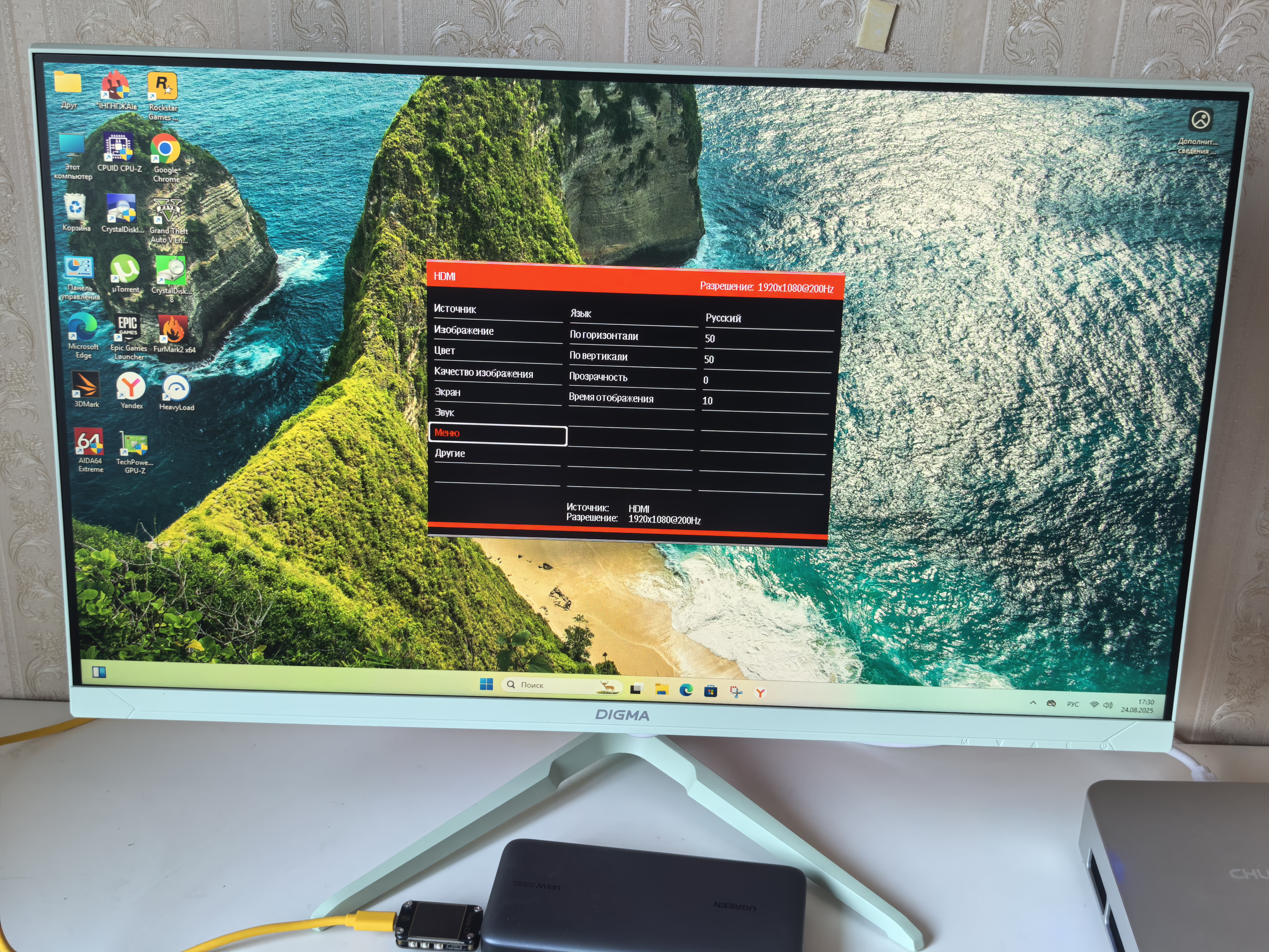 На фотографиях ниже показал работу подсветки и питание монитора от внешнего аккумулятора. Напряжение в 12В есть в большинстве повербанков. Если надо будет подключить через переходник Digma Overdrive 23,8″ к ним, проблем не будет. Главное, иметь соответствующий PD/DC-триггер на 12В.