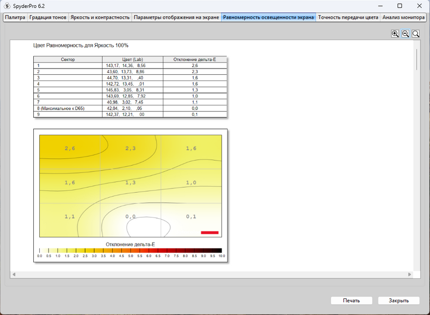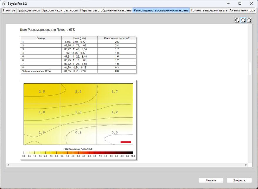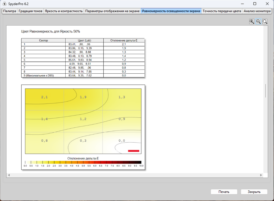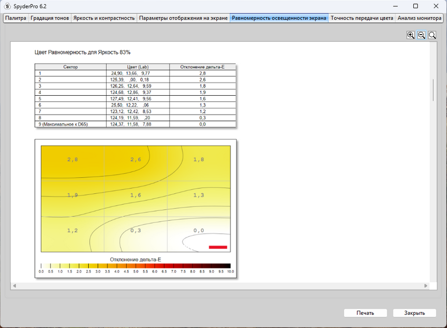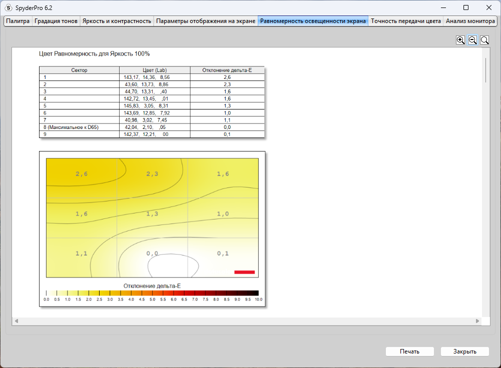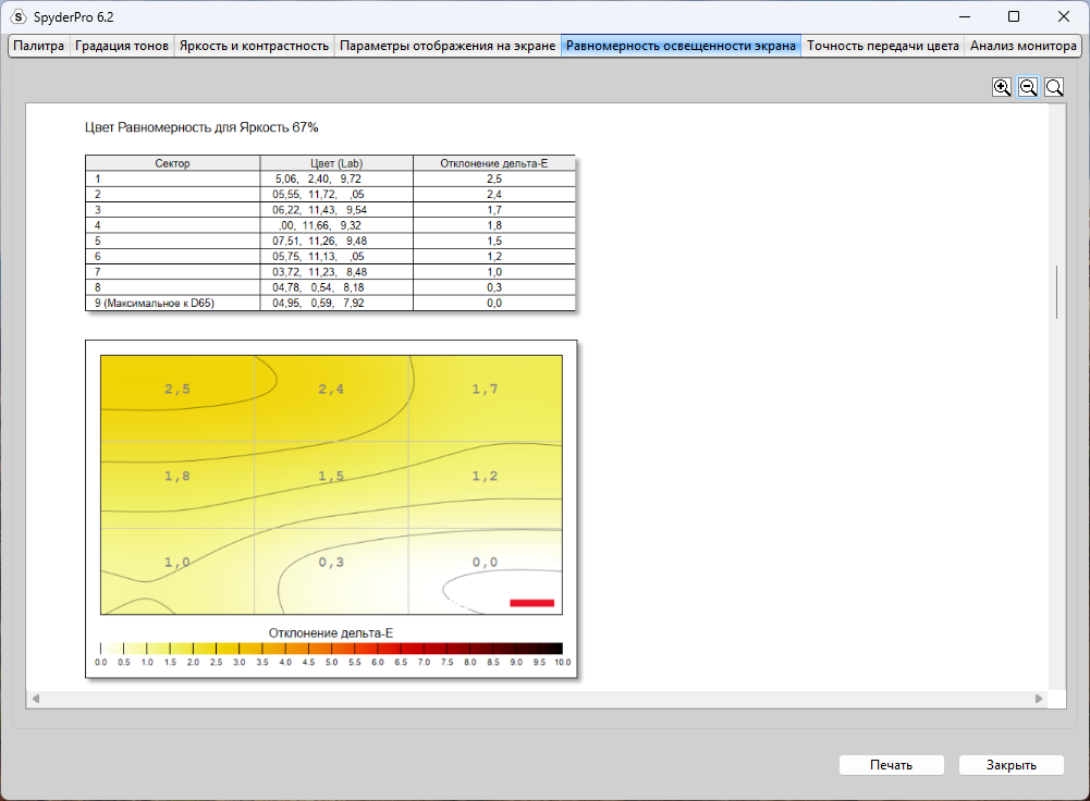Равномерность распределения цветов относительно уровней яркости и серого оттенка при 100, 83, 67 и 50 %% показана на итоговых скриншотах ниже. Минимальное отклонение в цвете (D65) будет в нижнем правом углу. Остальная область обладает ∆Е около 1,5. Обозначение «D65», относительно которого соотносятся другие участки экрана, описывает профиль света при температуре 6500⁰К, который широко применяется для адекватного отображения контента для повседневных задач, игр и работы на мониторе. Видно, что более равномерное распределение отклонений ∆E наблюдается при яркости в 50%, что, по предыдущей таблице, соответствует уровню в 170 кд/м². Уровень в 170 кд/м² считается завышенным, так как обычно экраны калибруют под яркость в 120 кд/м². Уровень в 50% яркости так же соответствует наименьшему отклонению по серому цвету.