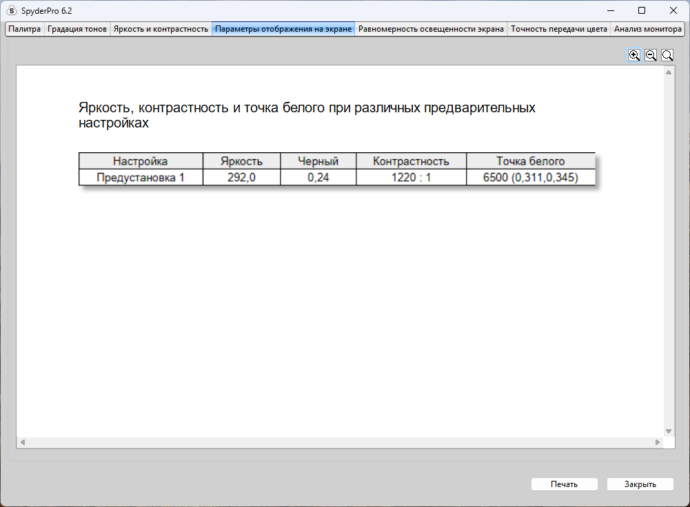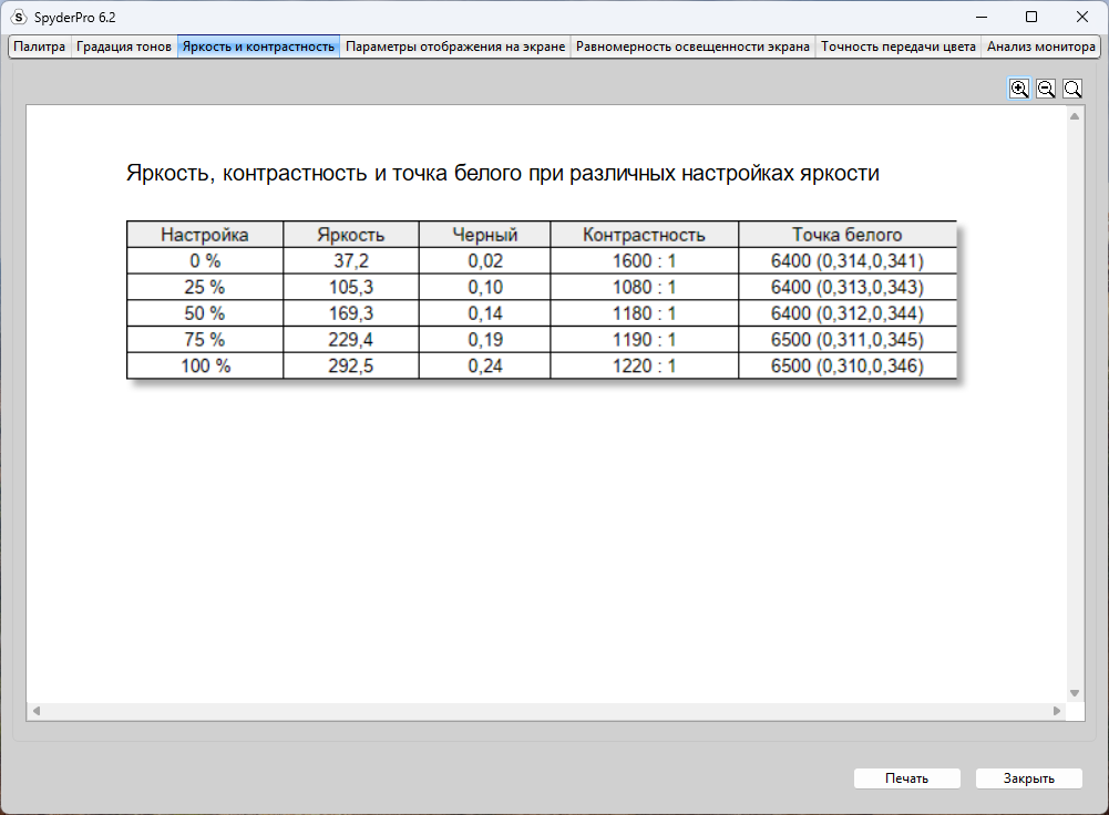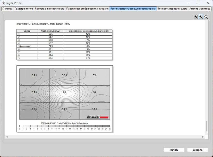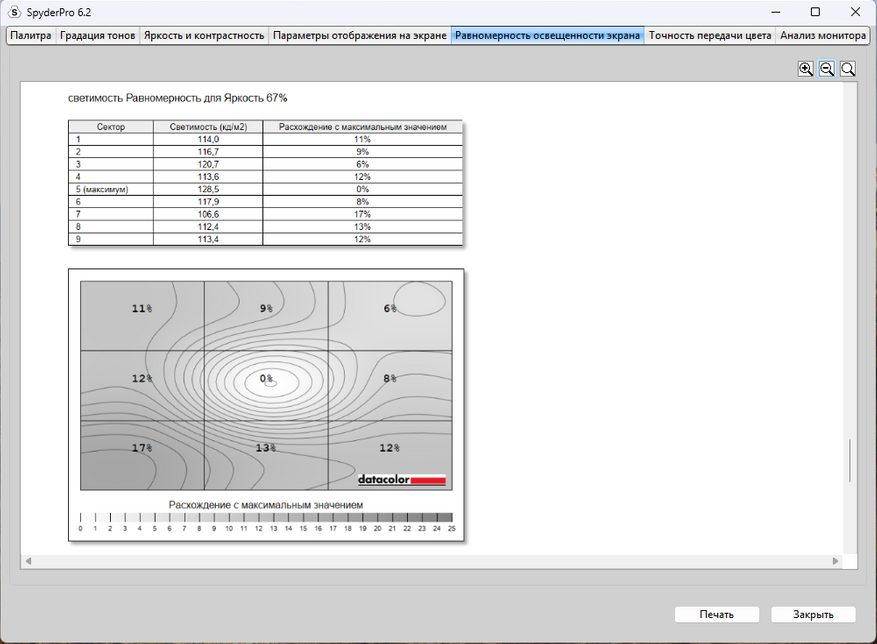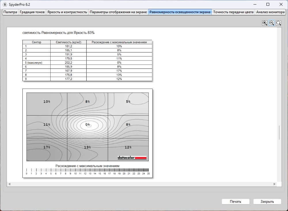 Равномерность распределения цветов относительно уровней яркости и серого оттенка при 100, 83, 67 и 50 %% показана на итоговых скриншотах ниже. Минимальное отклонение в цвете (D65) будет в нижнем правом углу. Остальная область обладает ∆Е около 1,5. Обозначение «D65», относительно которого соотносятся другие участки экрана, описывает профиль света при температуре 6500⁰К, который широко применяется для адекватного отображения контента для повседневных задач, игр и работы на мониторе. Видно, что более равномерное распределение отклонений ∆E наблюдается при яркости в 50%, что, по предыдущей таблице, соответствует уровню в 170 кд/м². Уровень в 170 кд/м² считается завышенным, так как обычно экраны калибруют под яркость в 120 кд/м². Уровень в 50% яркости так же соответствует наименьшему отклонению по серому цвету.