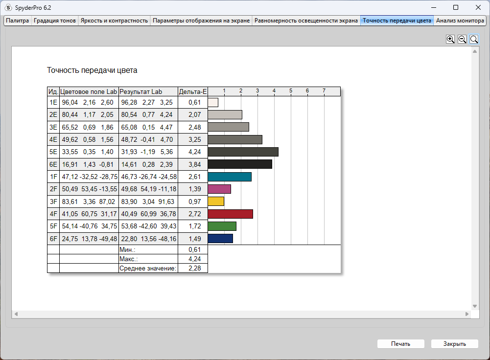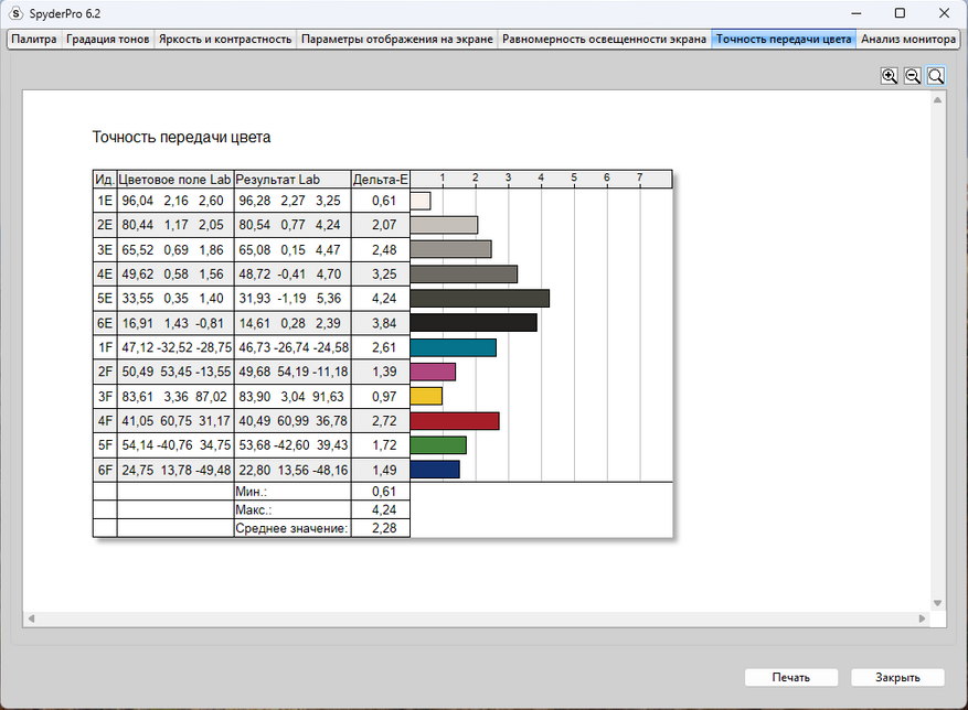 На следующем графике показан результат ∆E по цветам. Наименьшие отклонения у белого и оранжевого оттенков. Среднее значение получилось, по итогам оценки колориметра, в 2,28. Для домашнего использования это приемлемый разброс.