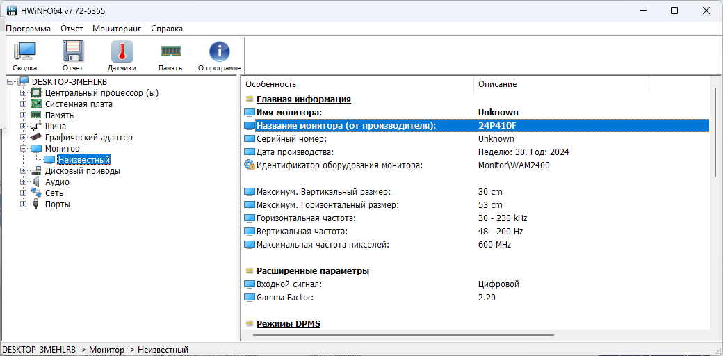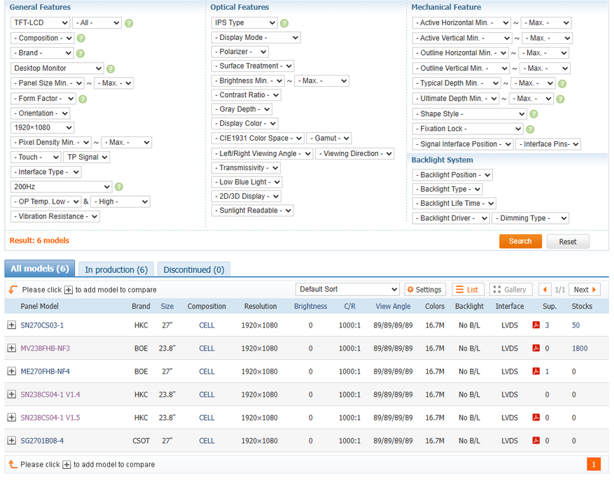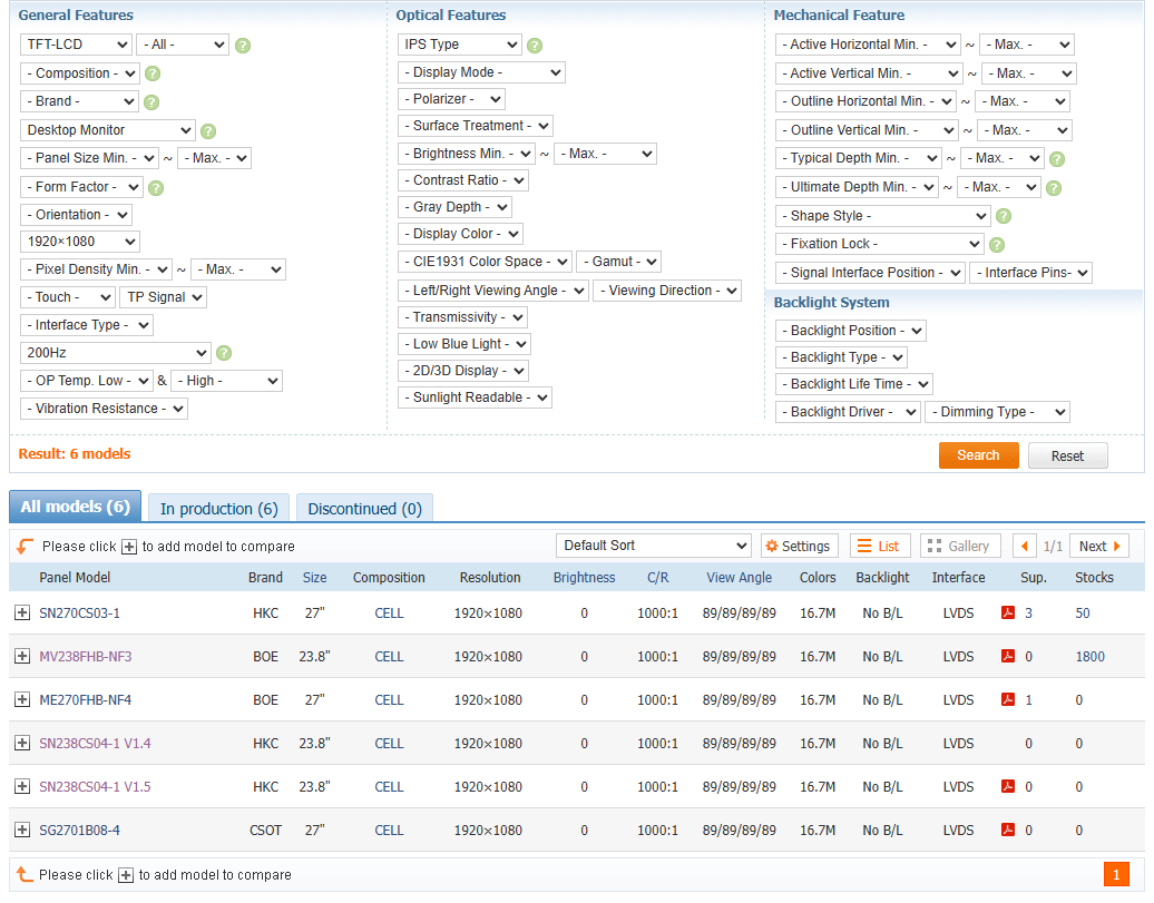 Объединил в один раздел две самостоятельные части, чтобы не разделять одну смысловую идею. В сети нашел информацию, что Digma использует матрицы BOE, но наименование ни от производителя 24P410F, ни ID монитора WAM2400 ни к чему не привели. Отфильтровал по производителю мониторы на сайте panelook.com, поставив в фильтр яркость, частоту обновления и диагональ. Сайт выдал 6 наименований, из которых близкой была матрица BOE, модель MV238FHB-NF3. На скриншотах показал процесс подбора.