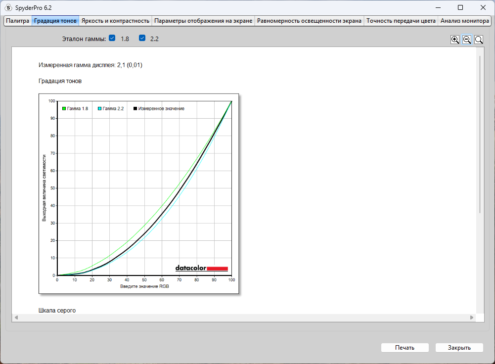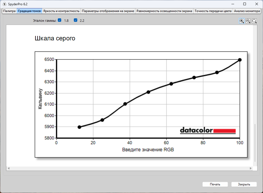 Соотношение черных и белых цветов монитора приблизительно соответствуют кривой гамма 2,2, что видно по первому графику ниже. По второму графику видно, что цвет экрана ближе к холодному оттенку, так как соотношение температуры по Кельвину (6400-6500⁰К) с RGB дают холодный свет. Поэтому использование возможности по настройке тона монитора «Холодный» выглядит бессмысленно, так как он уже «Холодный». «Теплее» он точно не станет.