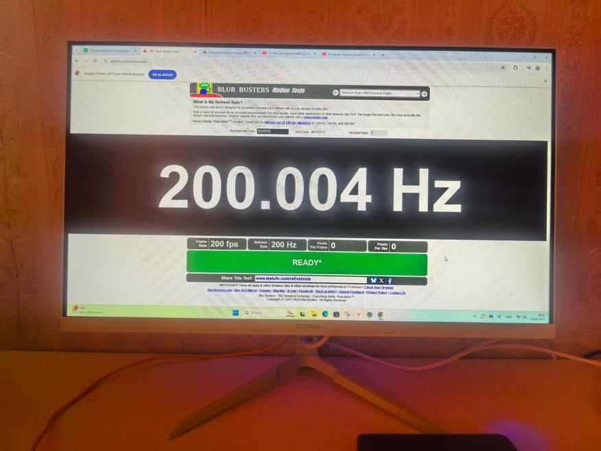 «Онлайн» тесты проводил на сайте www.testufo.com. Не все из них получится показать в статичном текстовом формате, но некоторые приведены. Первая фотография показывает, есть ли на экране пропуск пикселей. Если бы квадратики были заполнены с пропусками, то тогда бы они были. Как видно по первой фотографии с выдержкой, пропусков нет. Вторая показывает настоящую частоту обновления. Она составляет 200Гц, как и заявлено в характеристиках. Этот результат важен, так как после разборке, по характеристикам модели матрицы, сайт panelook.com говорил о 180Гц.