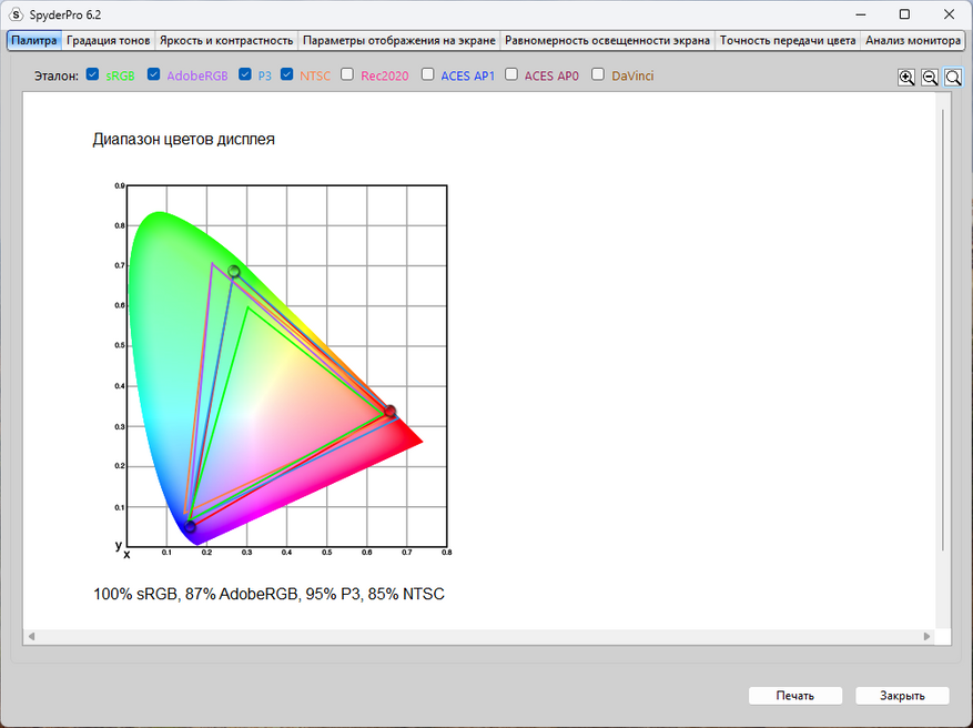 Заявленные характеристики матрицы проверил с помощью Datacolor Spyder Pro. Результаты представил ниже. У экрана 100% покрытие sRGB, как и заявлено в характеристиках. По моей оценке, AdobeRGB покрывается на 87%, P3- на 95%, NTSC — 85%.