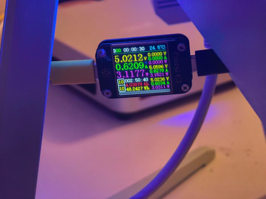 На следующих фотографиях просто показал вариант игры в GTA V. Картинка плавная. На втором показал потребление энергии монитором за примерно 3 ч работы, 46Wh. На третьем показываю, что при подключении монитора по USB-C в порт мини-ПК Chuwi AuBox, работать будет только подсветка на 5В, сам экран не включится. Подсветку можно использовать, как RGB-ночник, но для этого вам нужен PD/DC-переходник 5,0х1,8 мм на 5В. Тогда от внешнего аккумулятора ночью будет «красота». Или более простой вариант — от комплектного блока питания.