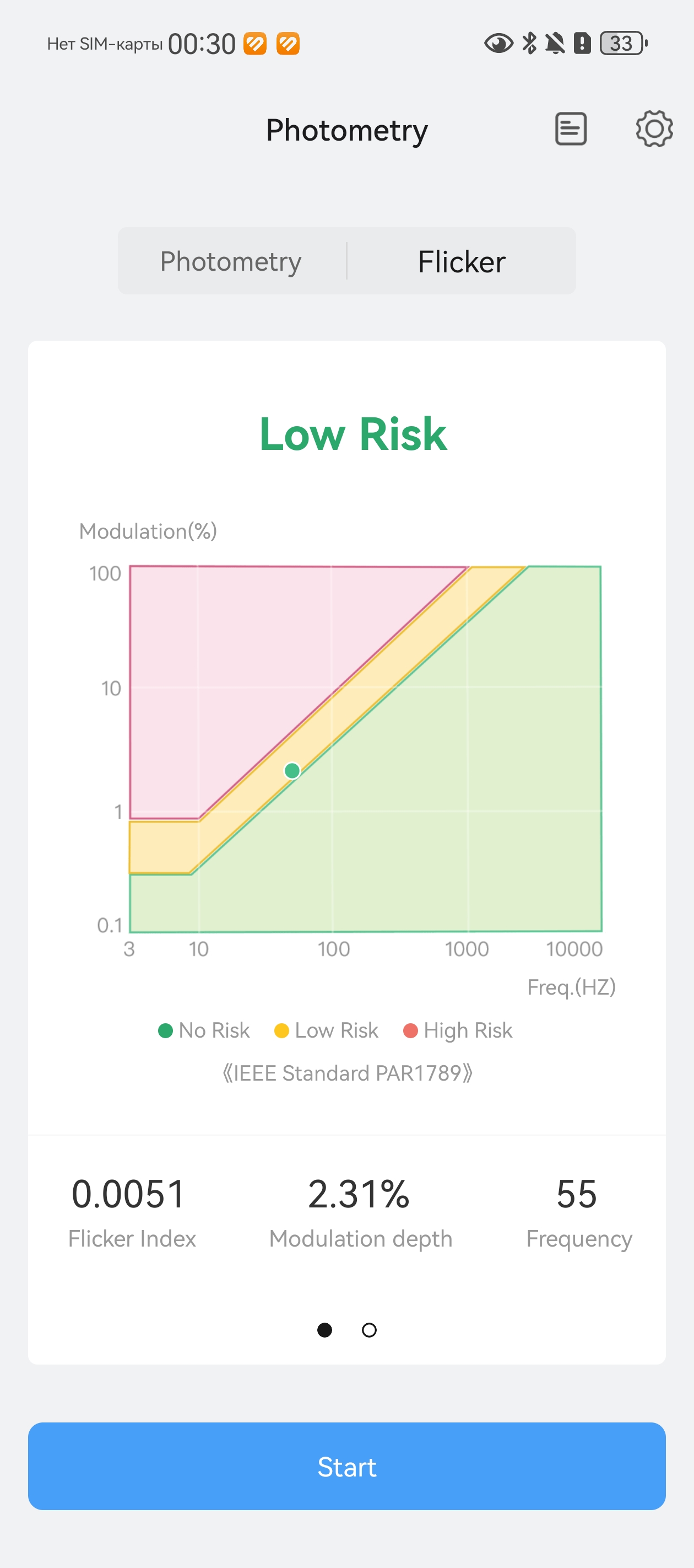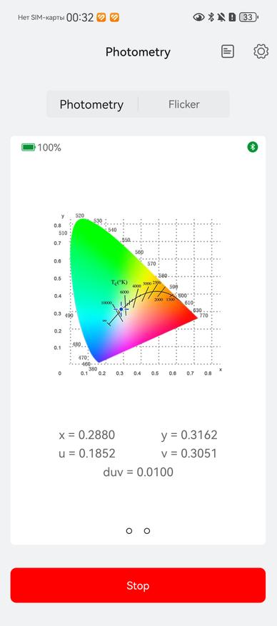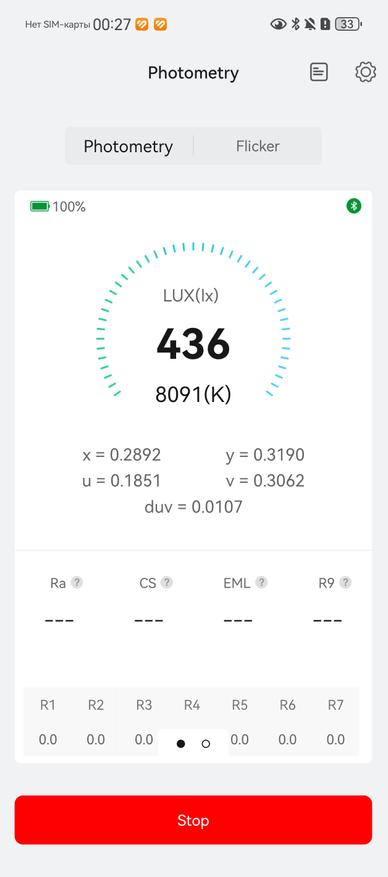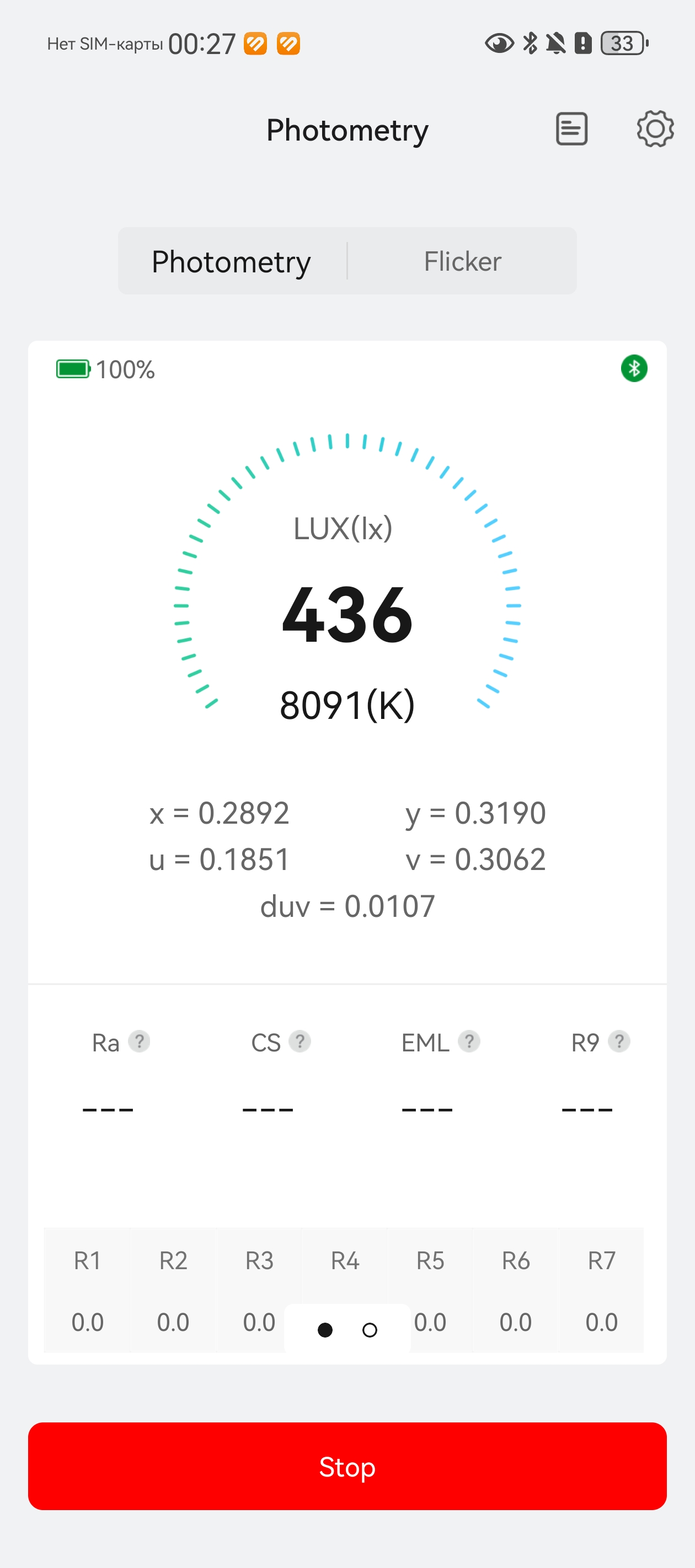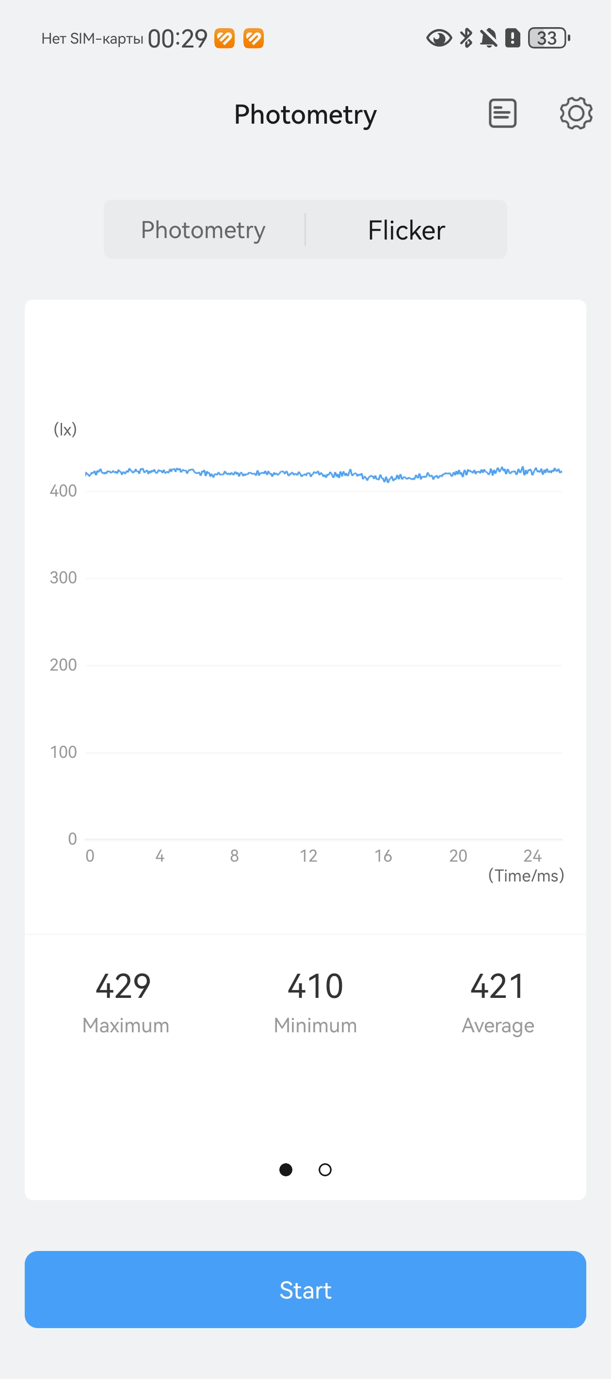 Результаты оценки освещенности, температуры, модуляции и ШИМа дисплея с помощью Opple Light Meter 4 показаны ниже. Главное отличие в них — это большая освещенность и цветовая температура. По прибору, Digma Overdrive имеет яркость в 436 Лк и температуру в 8000К. Первый показатель превосходит предыдущие два на 200-150 Лк, а второй на 1500⁰К. По температуре одинаково только одно — у дисплея «холодные» цвета. Считаю цифры на Opple Light Meter 4 завышенными и не соответствующими действительности.