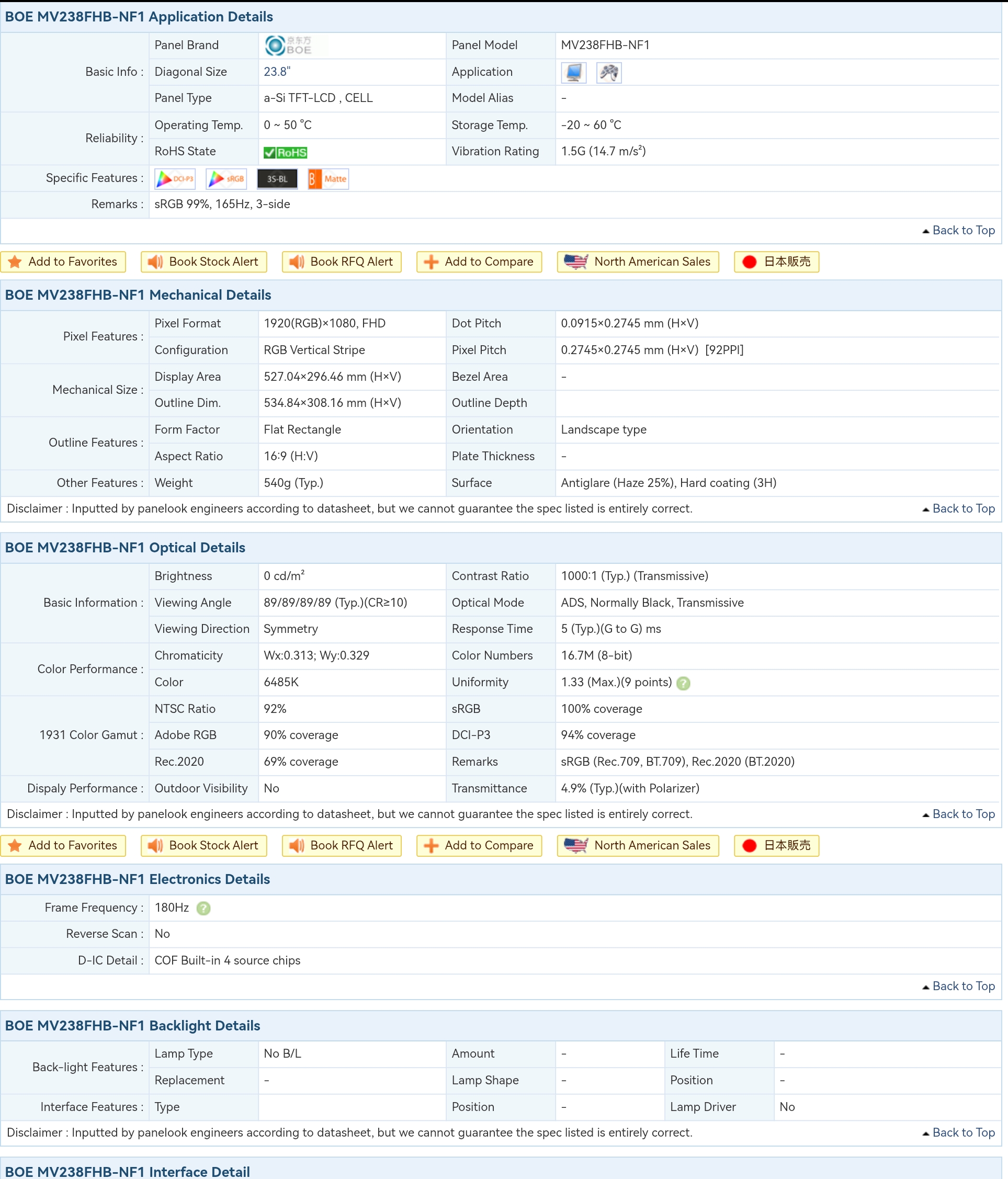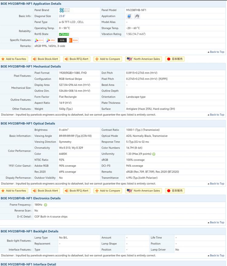 Ниже показал характеристики правильной матрицы монитора Digma Overdrive 23,8″. Видно, что по информации с сайта panelook.com, частота у нее 180Гц, а не как заявлено в характеристиках 200Гц. Несмотря на расхождения заявленного производителем и сайтом, в разделе про «онлайн» тесты частота подтверждается на заявленном уровне в 200Гц.