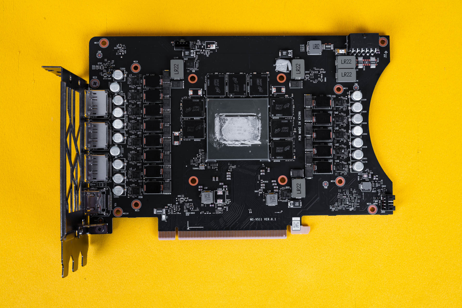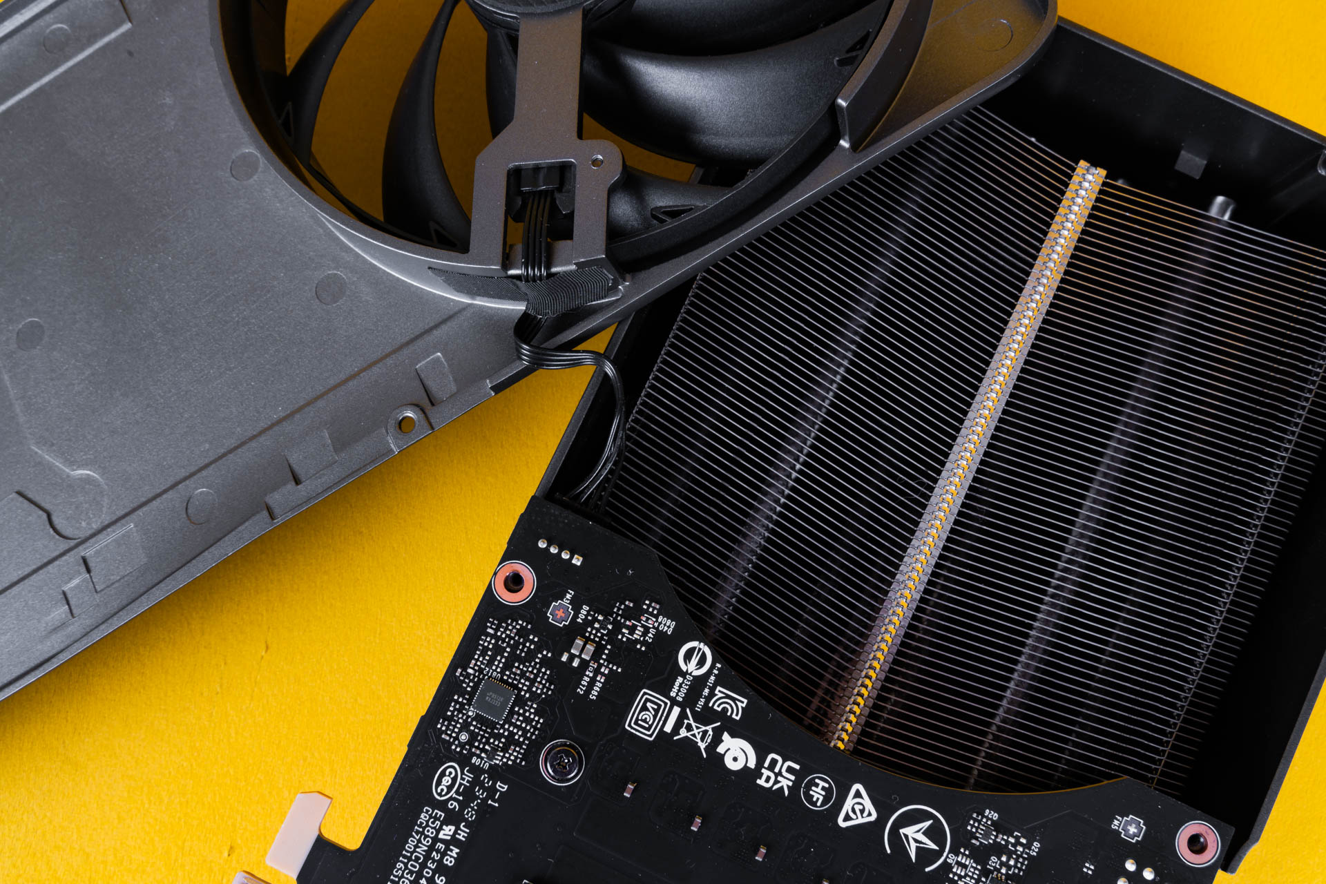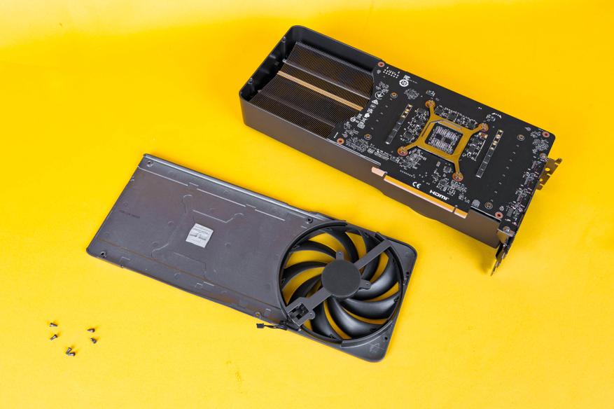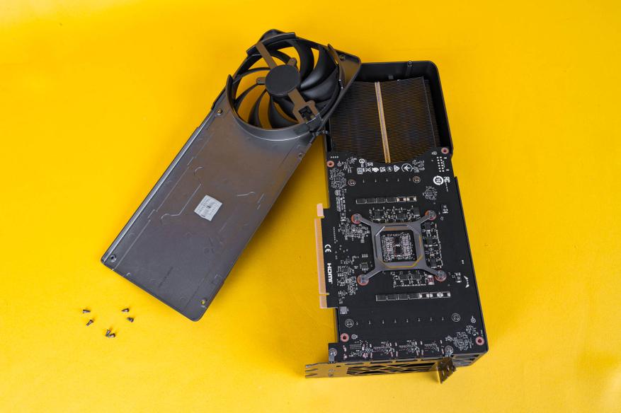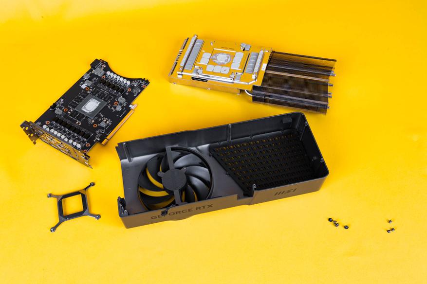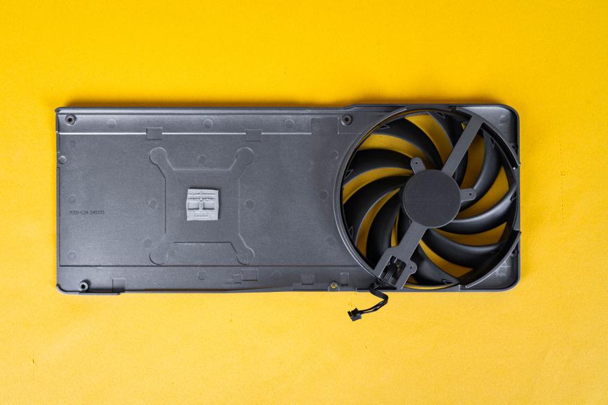 Чтобы детально рассмотреть из чего состоит система охлаждения и печатная плата MSI GeForce RTX 4080 SUPER, нужно будет её разобрать. При снятии нижней части кожуха видеокарты (также известной как бэкплейт) не забудьте осторожно отсоединить коннектор питания вентилятора, закреплённого на бэкплейте.