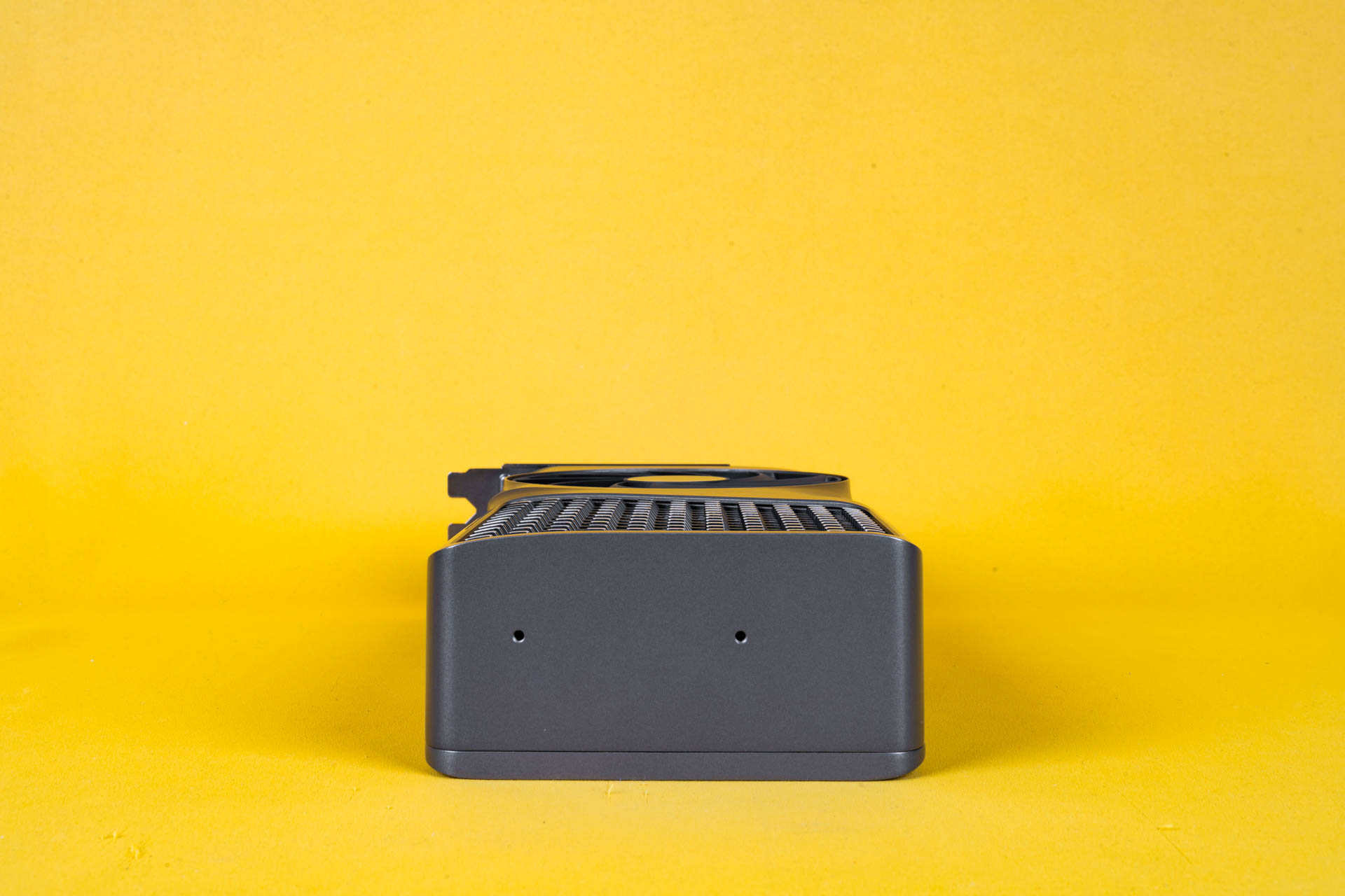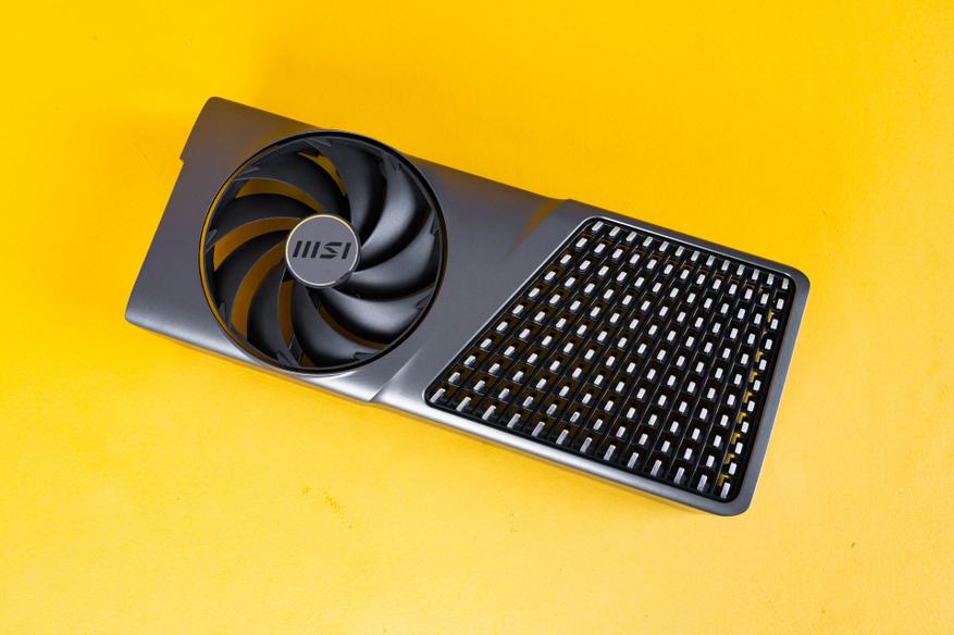 В GeForce RTX 4080 FE, так и в MSI GeForce RTX 4080 SUPER Expert имеется один вентилятор с девятью лопастями сверху и один вентилятор с девятью лопастями снизу. У одного вентилятора лопасти расположены стандартно, а у другого вентилятора — реверсивно. Оба вентилятора заключены в металлический кожух из алюминиевого сплава, окрашенный в матовый серебристый цвет. На первый взгляд кожух может показаться цельным из-за того, что детали идеально подогнаны друг к другу и между ними почти нет зазоров. Но в реальности это не так и кожух разборный. В оформлении можно отметить декоративную вставку на лицевой стороне кожуха с правой стороны, которая очень похожа на решётку радиатора.