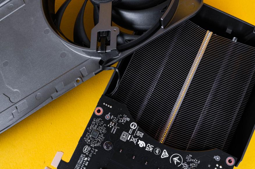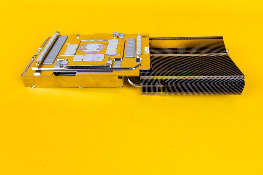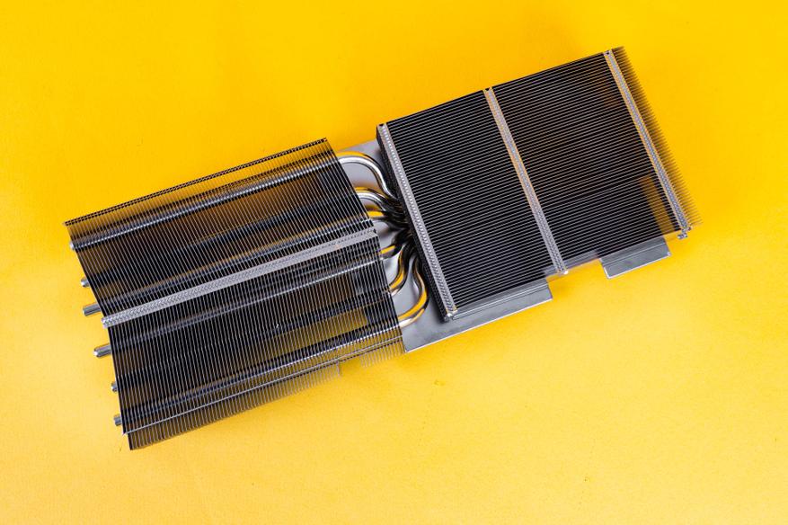 В конструкции данного радиатора можно отметить большую испарительную камеру, которая обеспечивает эффективный теплообмен не только с графическим процессором и чипами памяти, но и с зоной VRM. В верхней части испарительной камеры с помощью пайки зафиксированы 6 тепловых трубок. Диаметр трубок 6 мм, точно такой же диаметр трубок используется в башенных кулерах для охлаждения центрального процессора. На тепловых трубках закреплены алюминиевые пластины, которые отводят тепло. Затем это тепло рассеивается с помощью вентиляторов.