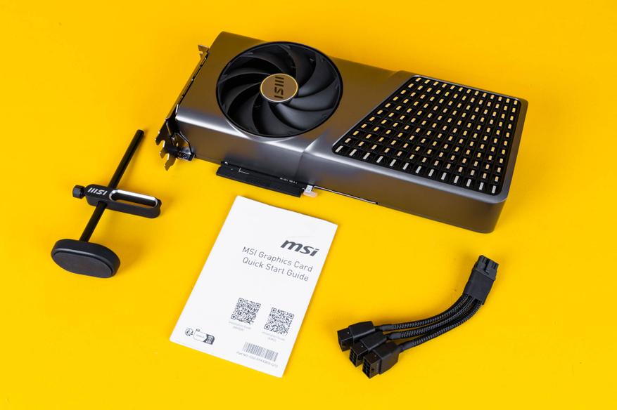 Вместе с видеокартой имеется расширенный ассортимент комплектации. Пользователь обнаружит руководство, переходник питания с 16-Pin 12VHPWR на 3x8-Pin и стойку для фиксации видеокарты.
