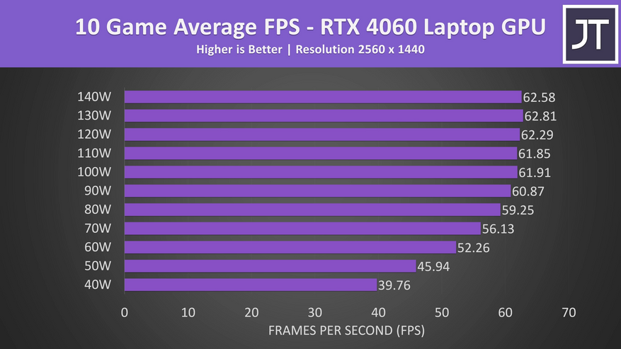 Блогер протестировал 3 ноутбука с упомянутыми выше видеокартами, во всех случаях производителями ноутбуков был заявлен максимально возможный TDP для этих моделей — 140 Вт. Тестирование проводилось в 10 современных играх, на графиках ниже приведены средние результаты для различных установленных вручную уровней TDP.