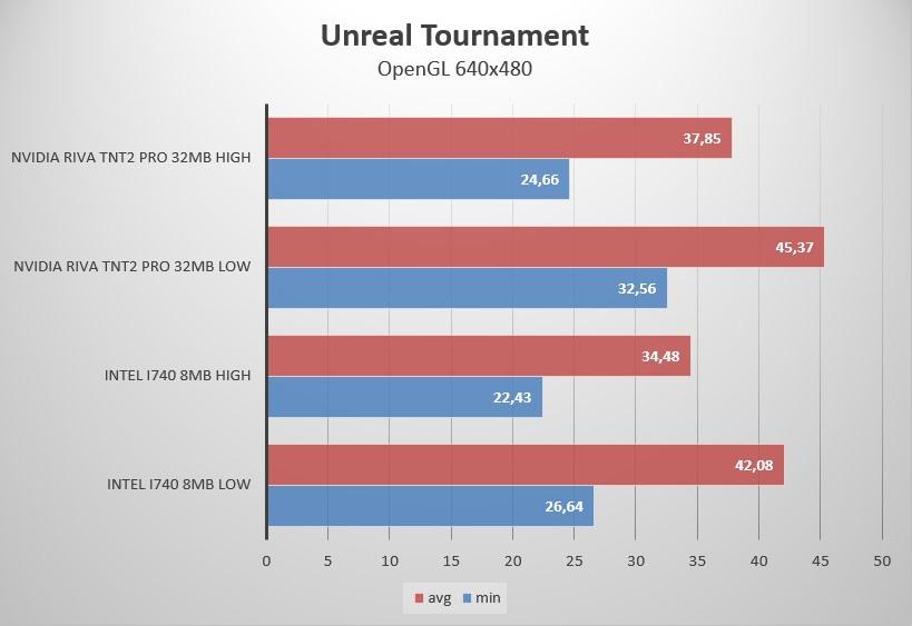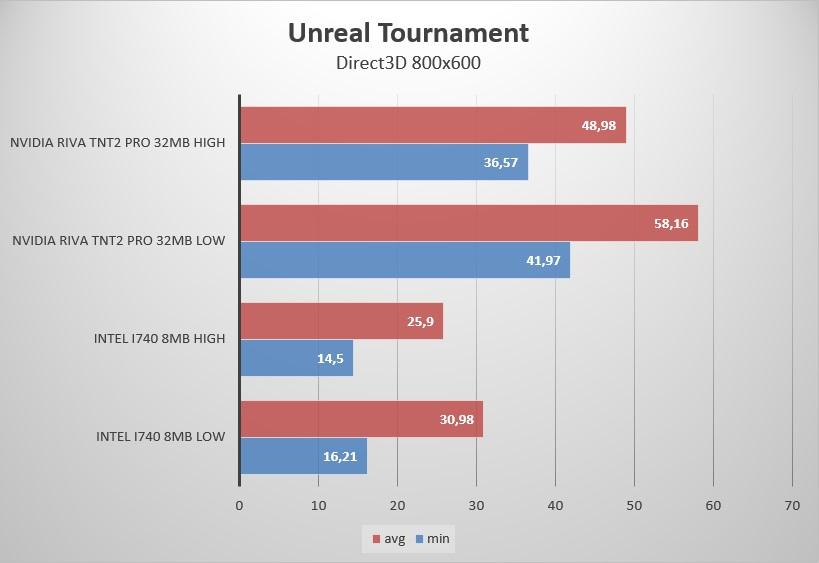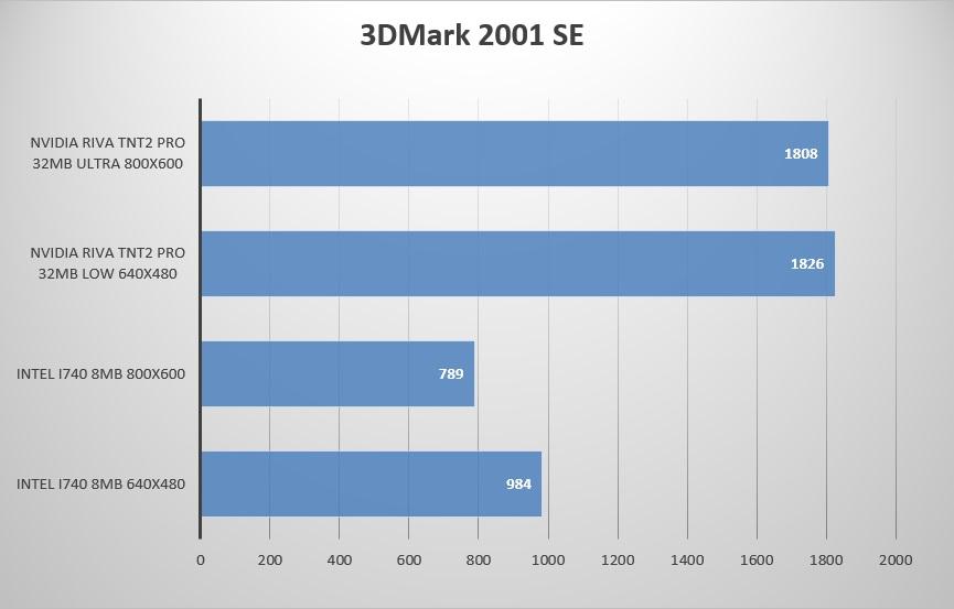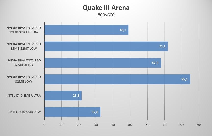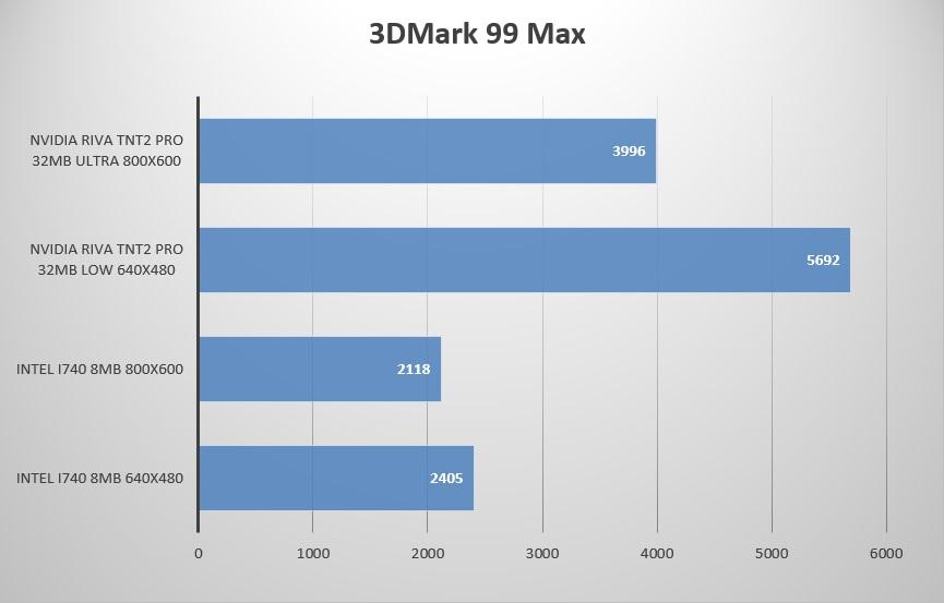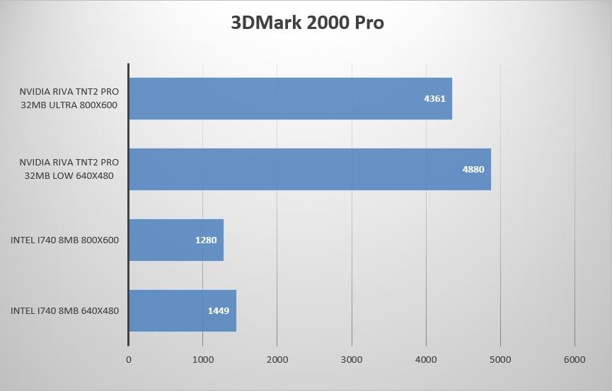 Вполне ожидаемое двукратное превосходство Riva TNT2 над встройкой Intel i815… вот бы сейчас топ видеокарты были всего в 2 раза быстрей чем встройки.