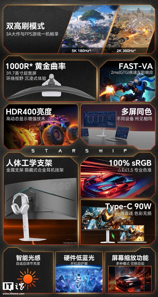 В основе монитора используется 40-дюймовая панель Huaxing HVA Fast VA с радиусом кривизны 1000R. Устройство поддерживает два режима работы: 2160P при 180 Гц и 1440P при 360 Гц. Пользователь переключается между режимами в зависимости от сценария использования — высокого разрешения или высокой частоты кадров. Такое сочетание среди сверхширокоформатных мониторов встречается редко.