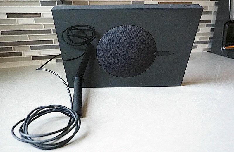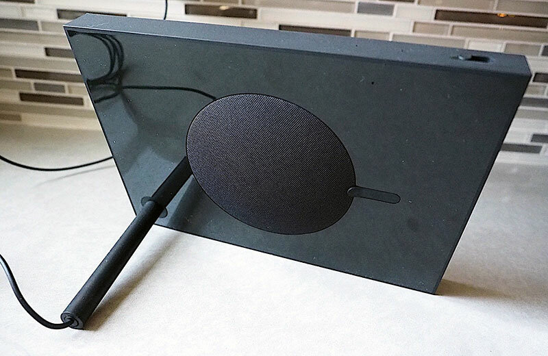 Сзади находится цилиндрическая подставка, благодаря которой Portal можно ставить как вертикально, так и горизонтально. Через неё проходит и кабель для подачи энергии. Возможность располагать экран вертикально и горизонтально есть на модели Plus, но здесь она реализована лишь за счёт подставки. Это удобно для видеозвонков, потому что собеседник может держать свой телефон вертикально.
