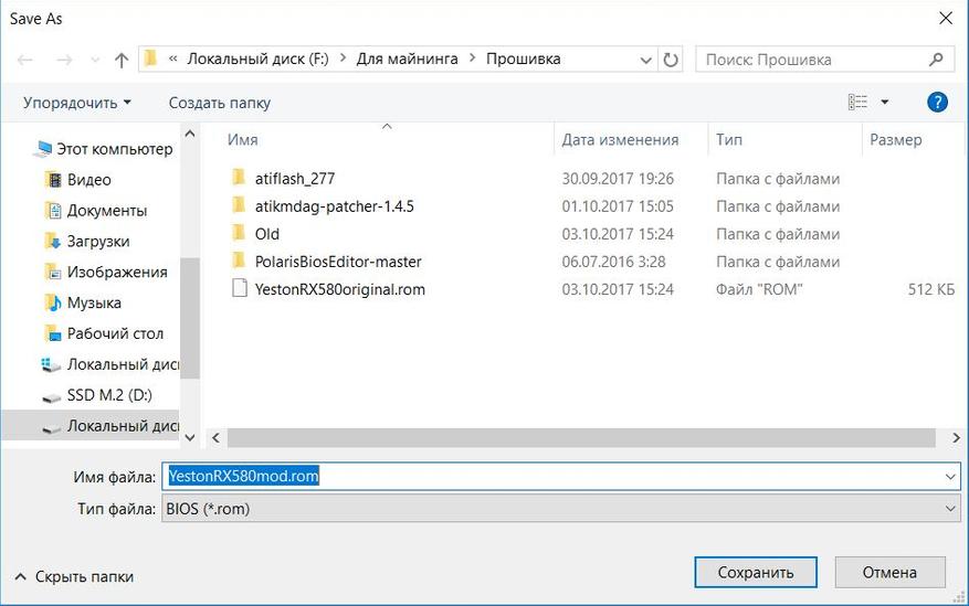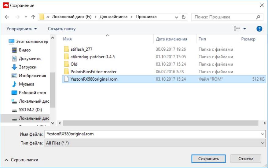 Далее, запустив утилиту AMD/ATI ATIFlash с правами Администратора необходимо сохранить оригинальный BIOS видеокарты. Для этого нужно нажать кнопку Save и указать имя, под которым будет сохранена прошивка.