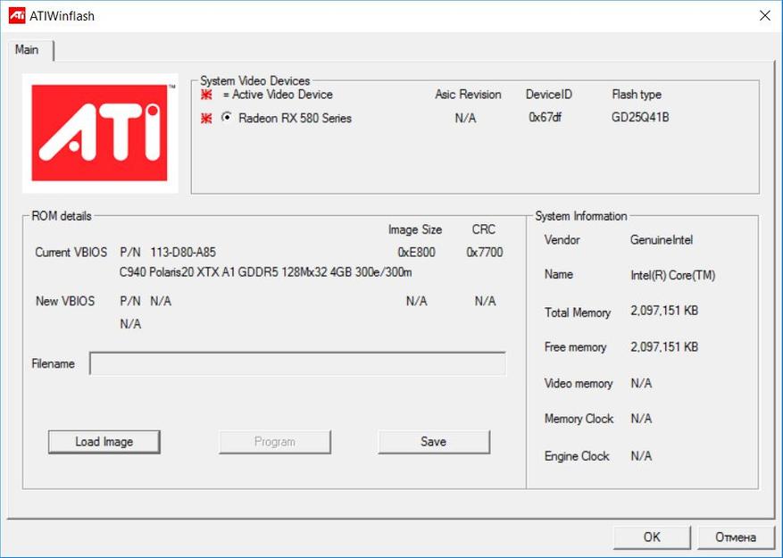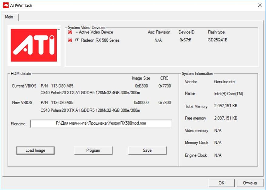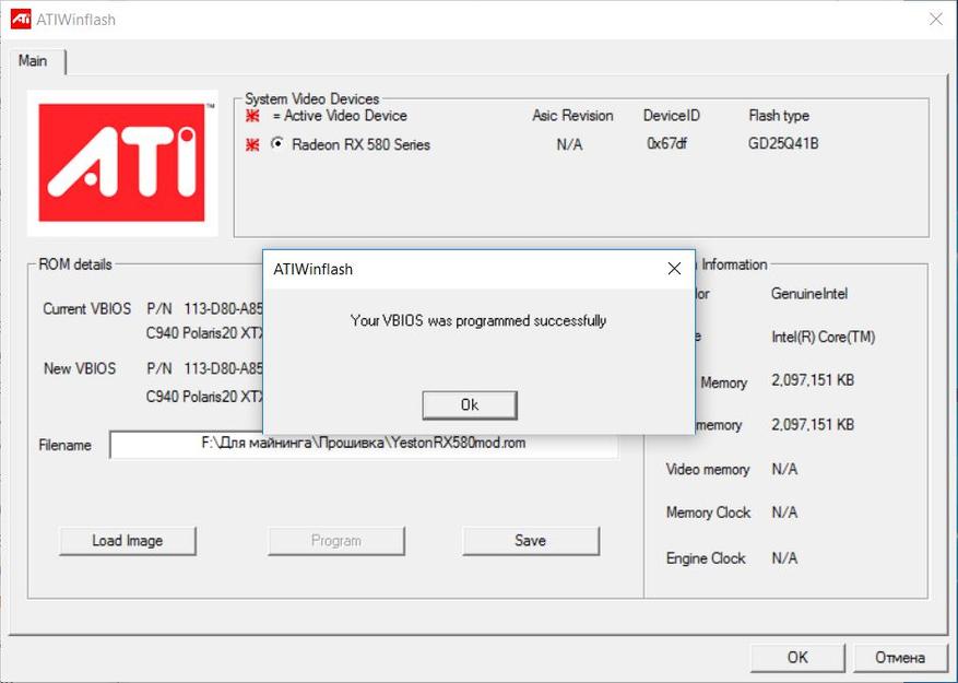 После этого снова запускаем AMD/ATI ATIFlash, кнопкой Load Image открываем нашу модифицированную прошивку после чего кнопкой Program запускаем процесс изменения BIOS видеокарты.