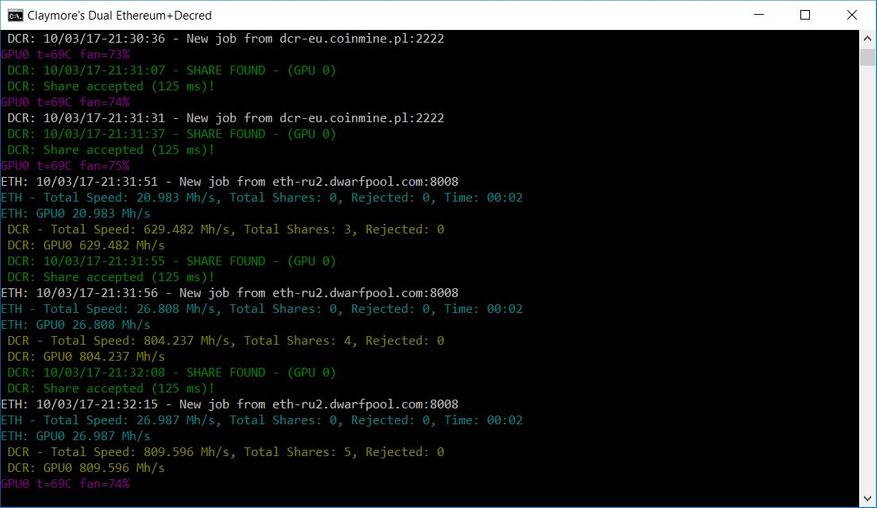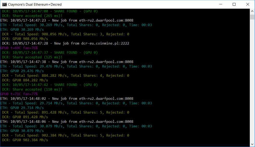 Производительность уже более 30 Mh/s в solo-режиме и 29+900 Mh/s в dual-режиме Ethereum+Decred.