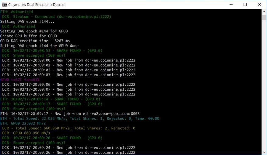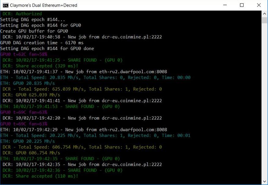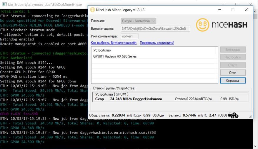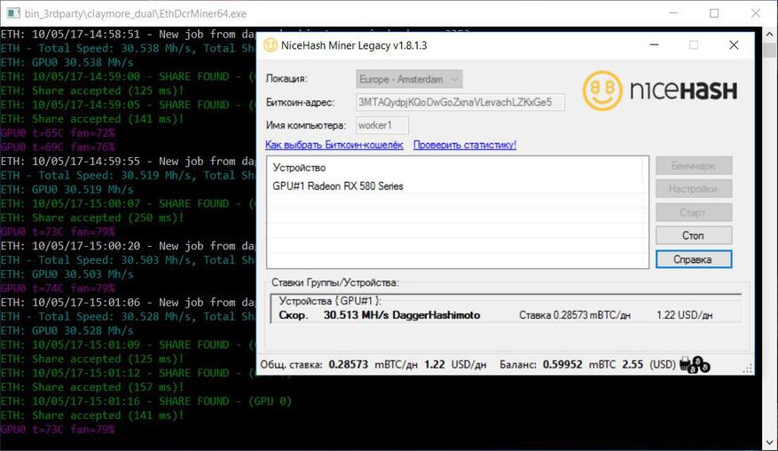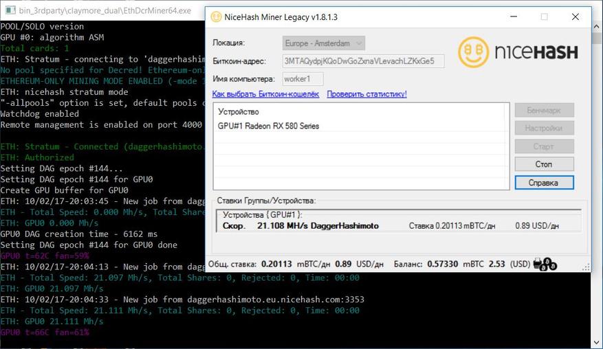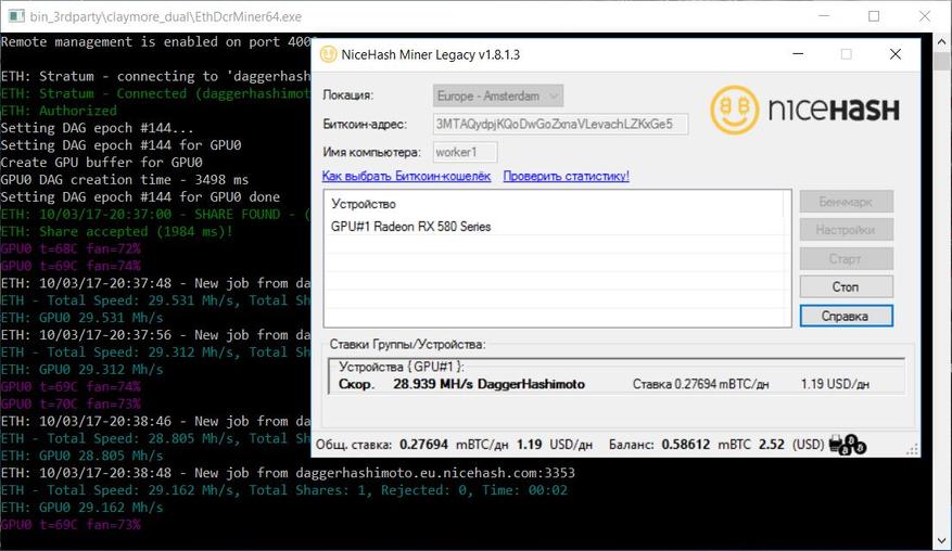 Далее скачиваем, устанавливаем и настраиваем майнер от сервиса NiceHash, а также наиболее популярный сейчас майнер «Claymore's Dual Ethereum+Decred/Siacoin/Lbry/Pascal AMD+NVIDIA GPU Miner». Последний интересен тем, что позволяет майнить не только эфир в одиночном-solo режиме, но и одновременно в сочетании с одной из других криптовалют (Decred/Siacoin/Lbry/Pascal) – dual-режим.