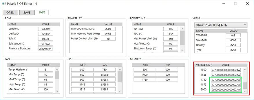 Запускаем утилиту Polaris Bios Editor и при помощи кнопки Open загружаем ранее сохраненную нами прошивку. На скриншоте ниже красным выделена секция с таймингами, а зелёным – страпы, значения в которых можно заменять.