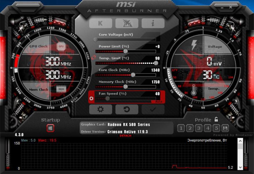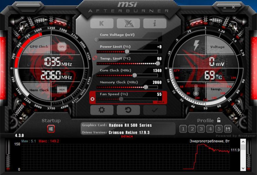 В таком режиме работы температура видеокарты держится в районе 70 градусов, а энергопотребление составляет около 110-115 Вт. Данные значения думаю вполне можно изменить в меньшую сторону еще немного поэксперементировав с понижением вольтажа и частоты графического ядра.