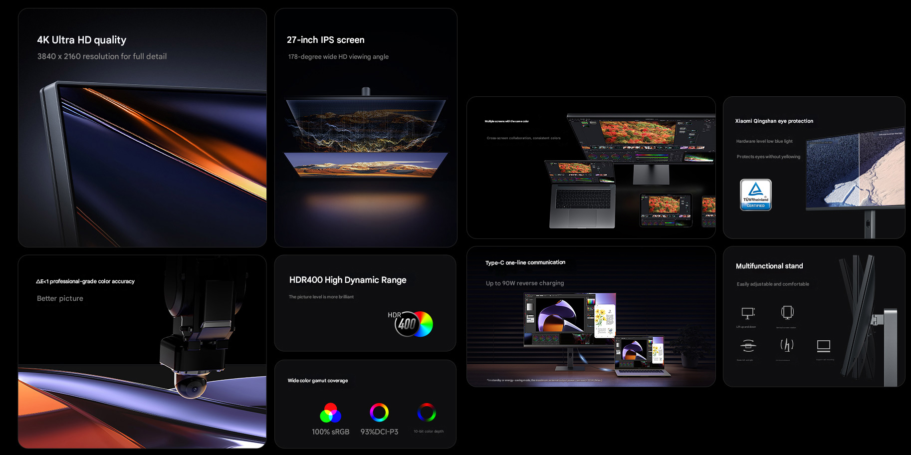 Экран остался 27-дюймовым IPS с разрешением 3840x2160, но теперь у него есть сертификат HDR400. Охват — 100% sRGB и 93% DCI-P3, пиковая яркость — 400 нит. Картинка, как обещает Xiaomi, стала заметно насыщеннее и контрастнее.