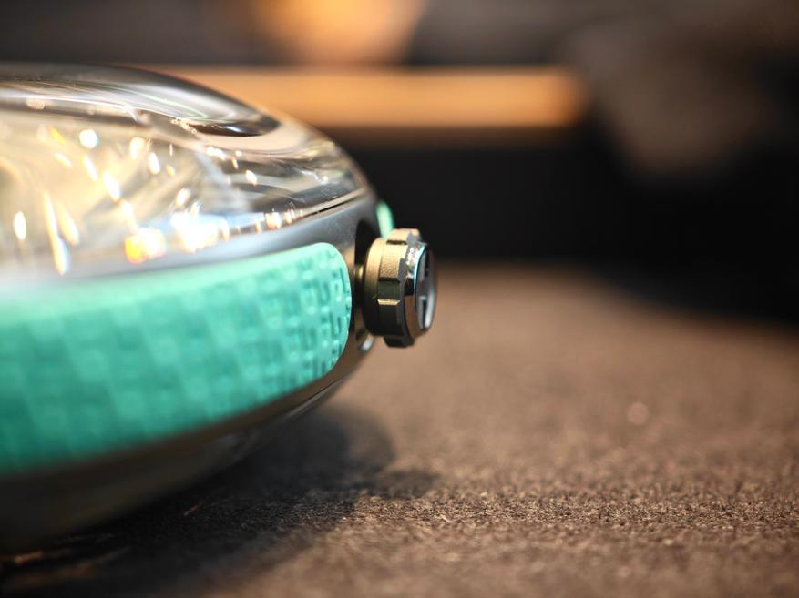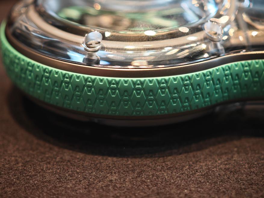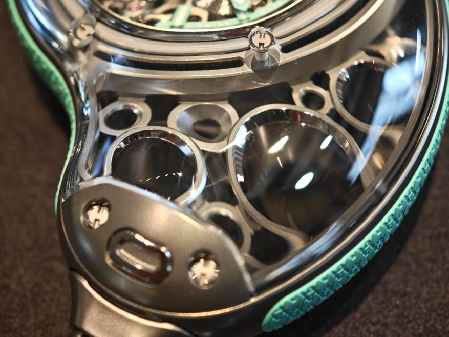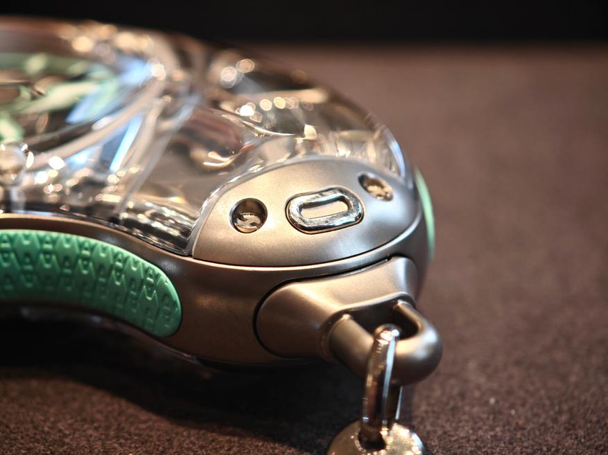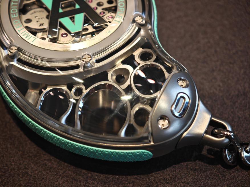 Секрет формы в названии часов — Droplet (капля). Образ подкреплен и многочисленными титановыми «пузыриками», один из которых «наполнен» калибром часов, и сапфировым стеклом, в котором все это находится. Форма корпуса не нарушает читаемости, но, как и положено капле «искажает время», символизируя как бы его текучесть, зыбкость, непостоянство, намекая на темы, характерные для эстетики Аршама (см., например, проекты «Песочные часы»).