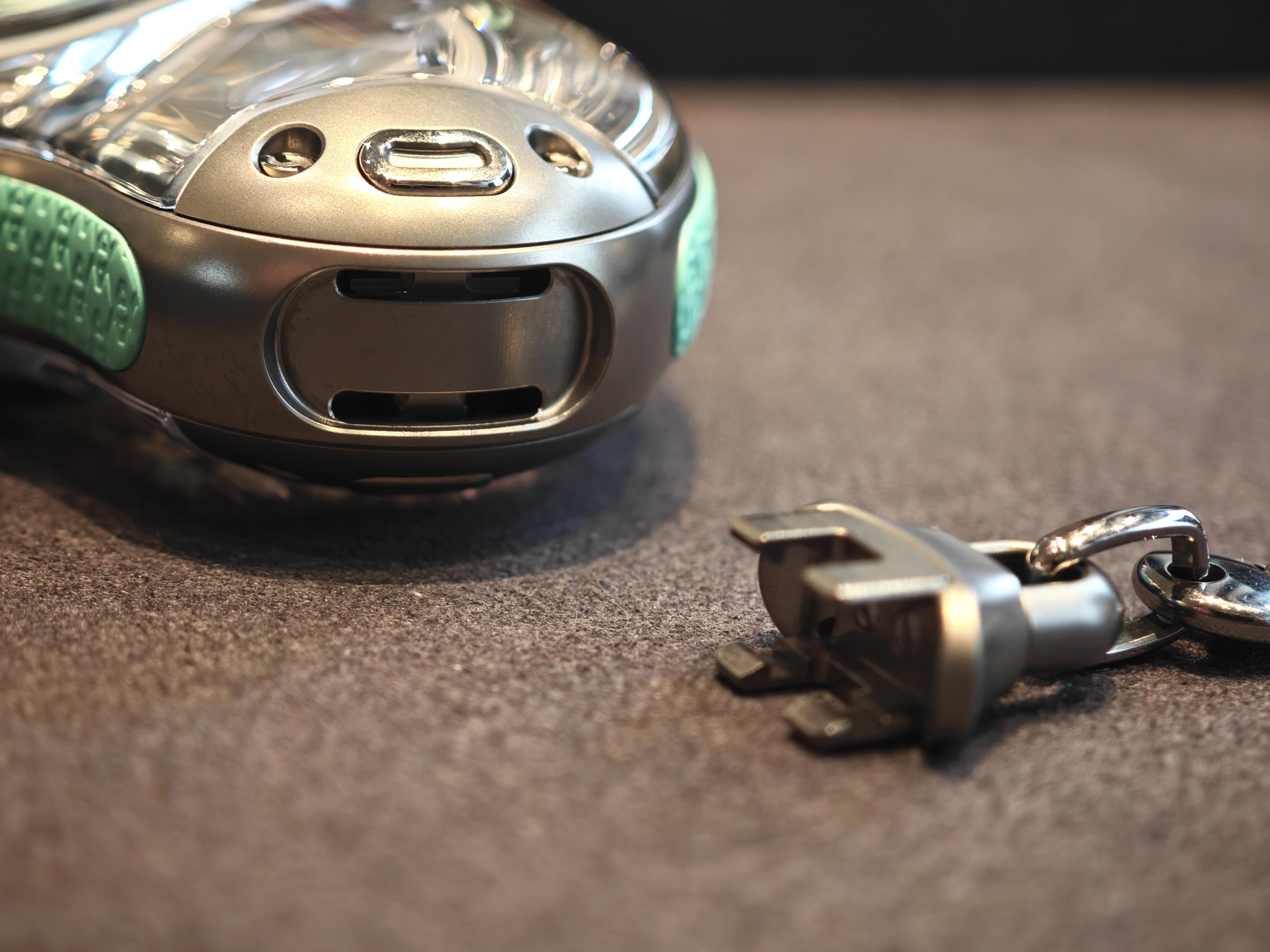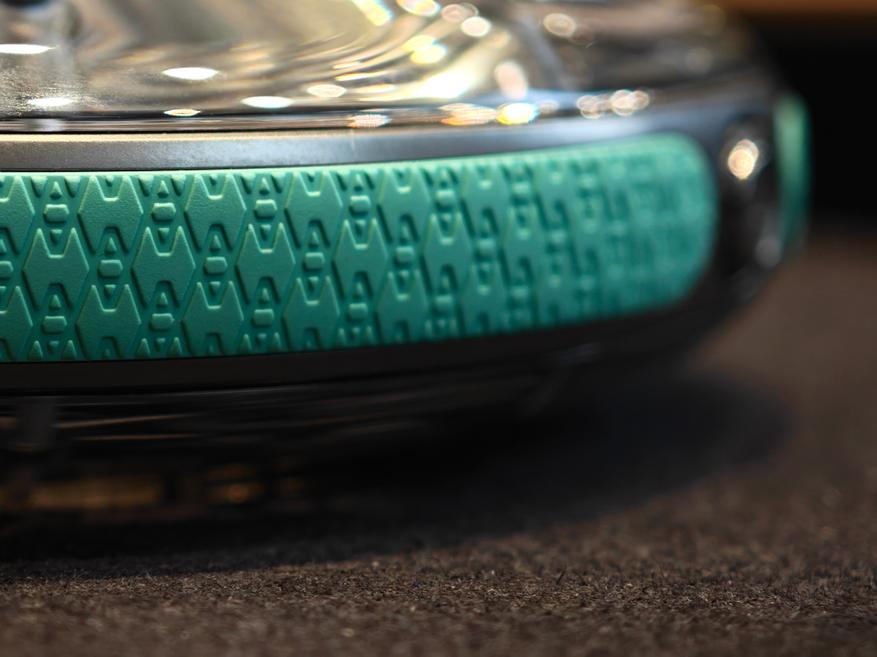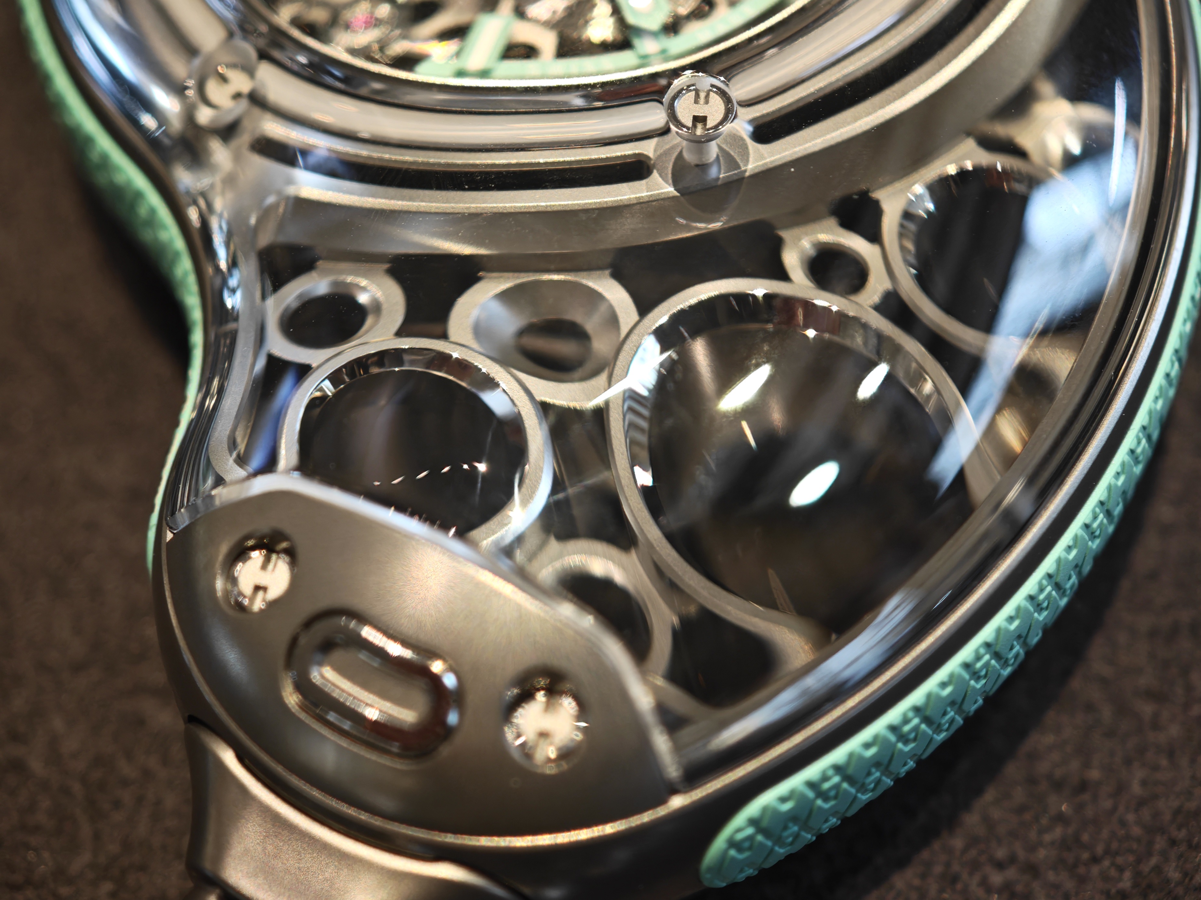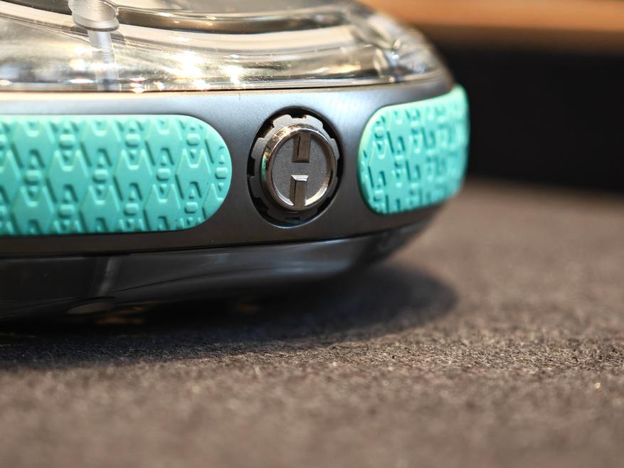 Часы для удобства имеют по бокам каучуковые бамперы, холодный цвет которых перекликается с цветом меток и стрелок скелетонизированного циферблата. Сам цвет — читаемая отсылка к ледникам. Фактура боковой поверхности оформлена логотипом художника, который визуально, если всматриваться, начинает напоминать и первую букву часового бренда «H».