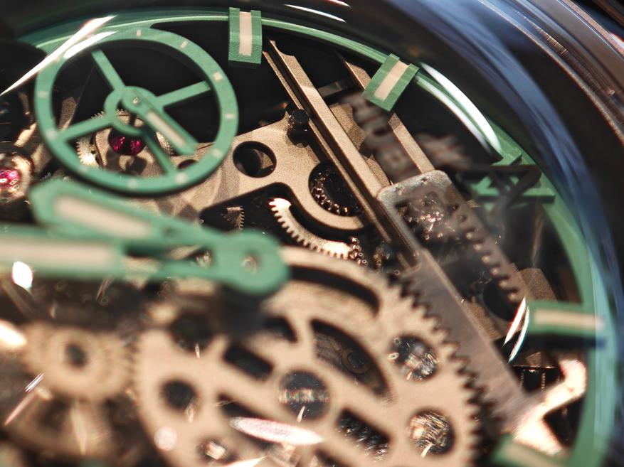 И, надо сказать, что его тоже интересно рассматривать с точки зрения произведения искусства, а уже затем — как шедевр механики. Сам калибр тоже словно «пузырится», искрится за счет и декоративных отверстий, и рубиновых камней механики.