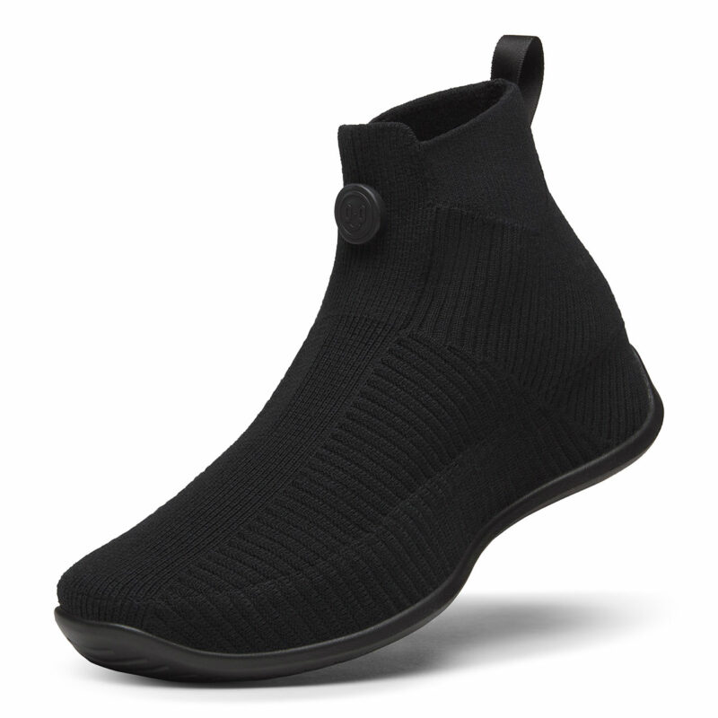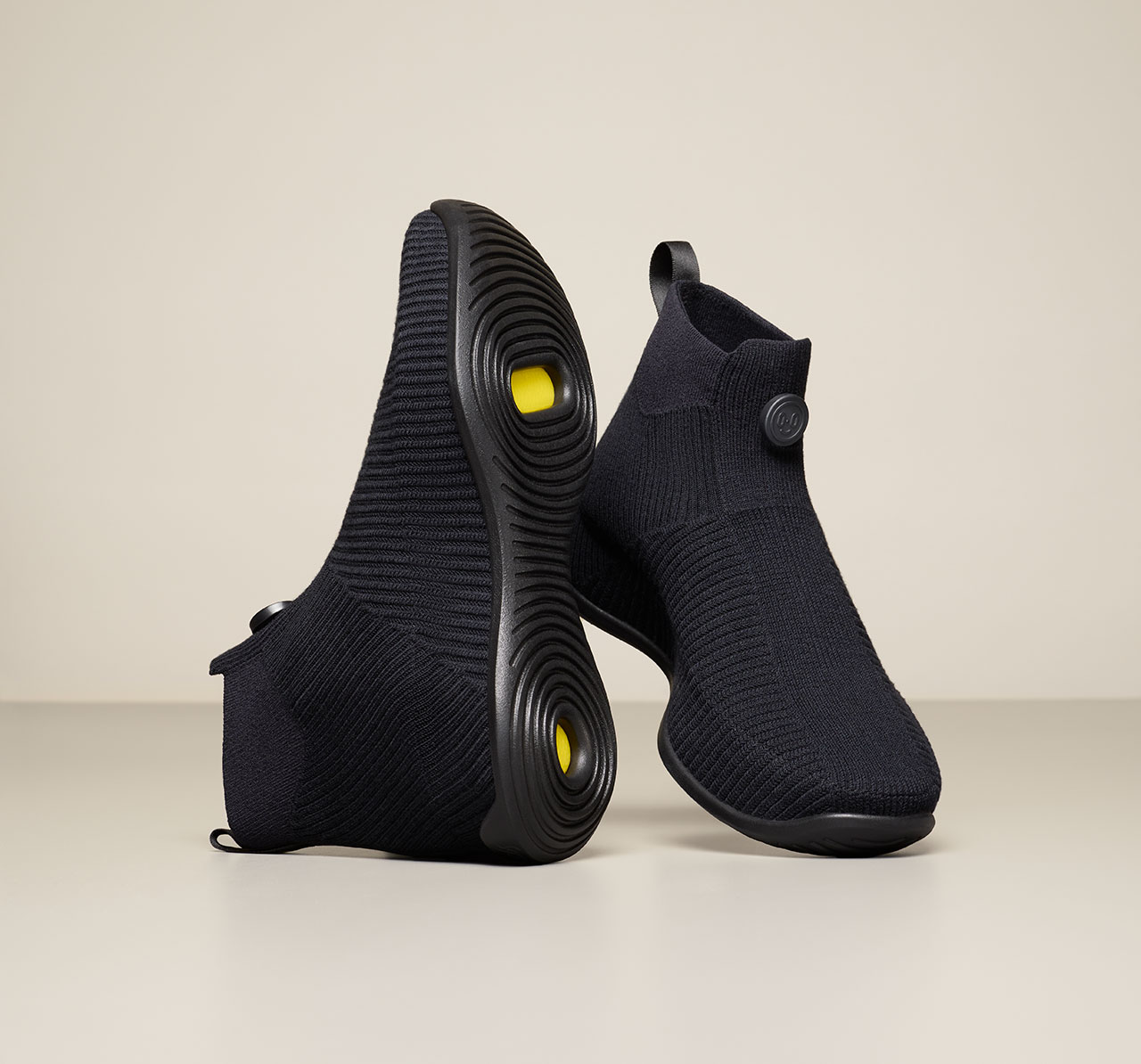 M0.0NSHOT Zero представляют собой высокие вязаные ботинки из шерсти с характерной ребристой текстурой, отличительными желтыми вставками на подошве и функциональной пуговицей в верхней части. Главной особенностью модели стал уникальный подход к нулевому углеродному следу, достигнутый без использования углеродных кредитов.