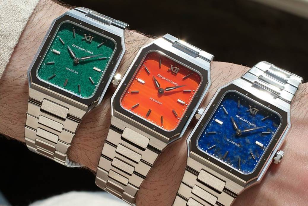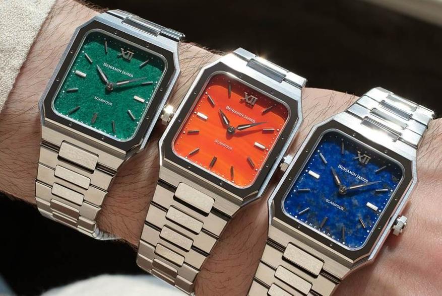 Британский часовой бренд Benjamin James Watches анонсировал выпуск трех новых вариантов часов серии Scarifour Limited Edition с циферблатами из натуральных камней. В коллекцию вошли модели с циферблатами из лазурита, зеленого нефрита и жженого оранжевого агата.