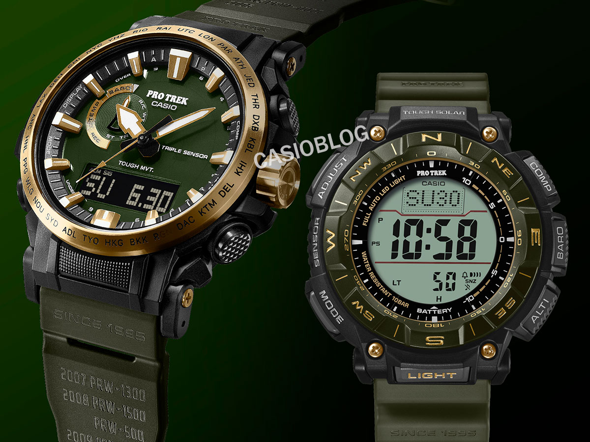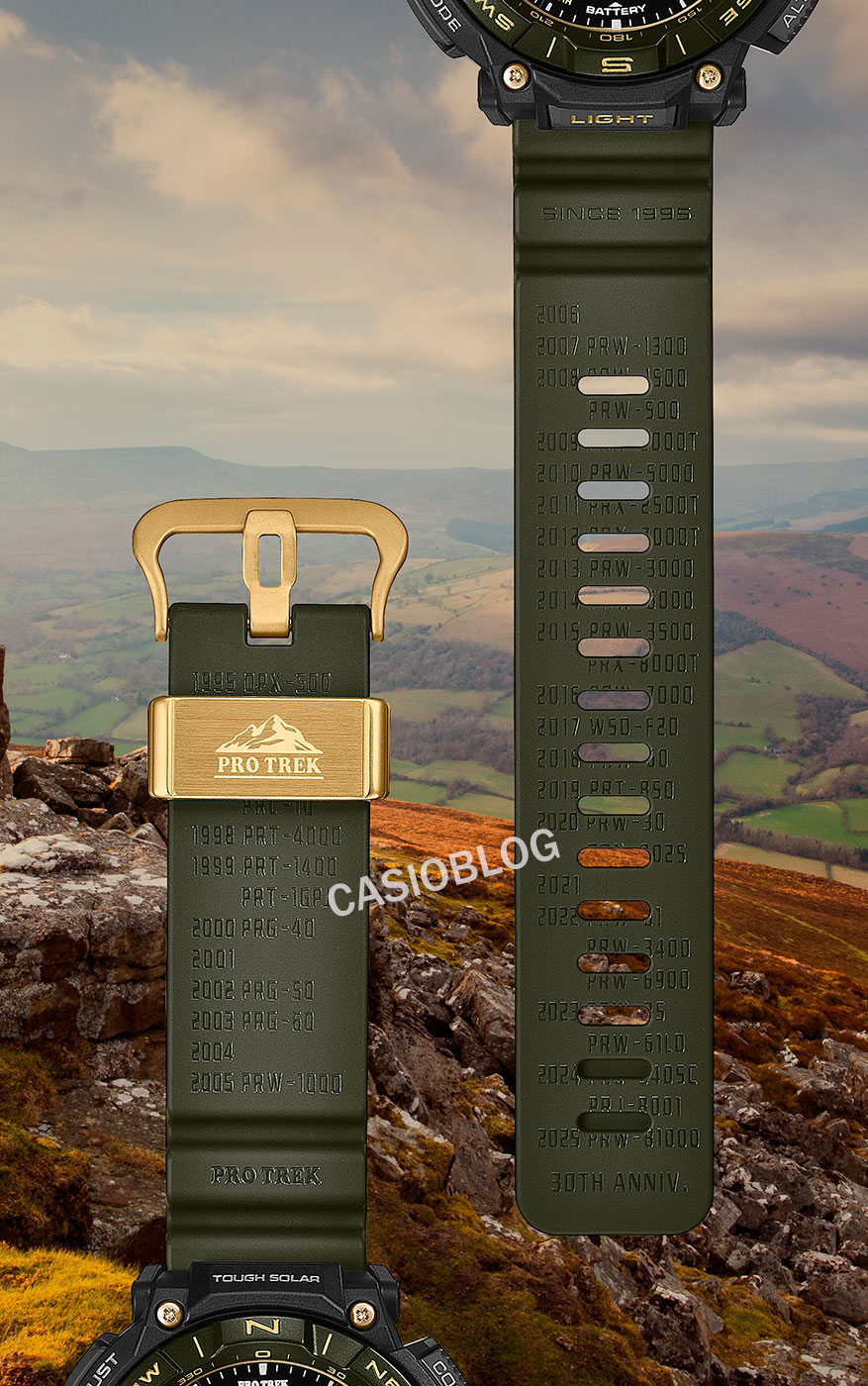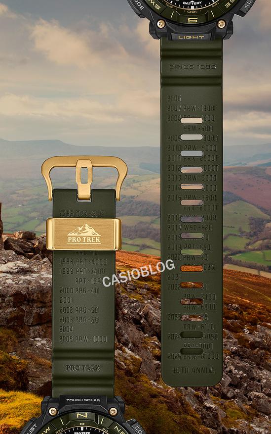 Гибридная модель PRW-61ANS-3 получила темно-зеленый циферблат и золотой безель из нержавеющей стали с ионным покрытием. Цифровая модель PRG-340ANS-3 выдержана в аналогичной цветовой схеме с зеленым дисплеем. Особенностью обеих моделей стали ремешки из смолы цвета хаки с гравировкой, отображающей названия исторических моделей Pro Trek и годы их выпуска — своеобразная дань уважения наследию бренда.