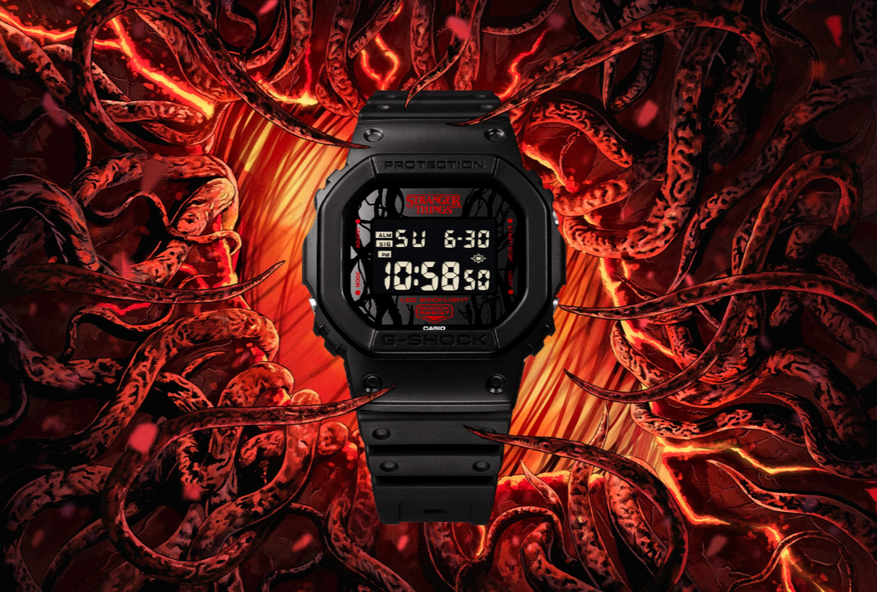 Компания Casio выпустила новую лимитированную версию часов G-Shock DW-5600STT-1JR, созданную в рамках коллаборации с сериалом «Очень странные дела». Модель посвящена «Перевернутому миру» — мрачной альтернативной реальности сериала, финальный сезон которого выходит в этом ноябре.