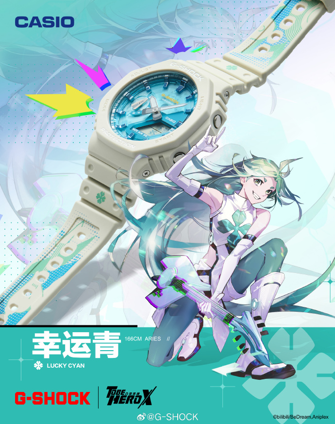Вторым представителем новой линейки стала модель GA-2100AS-5APRT, дизайн которой отражает образ персонажа Lucky Cyan из аниме-вселенной To Be Hero X. Визуально часы выделяются бежевым корпусом и декоративным сине-зеленым паттерном на ремешке. Конструкция изделия включает восьмиугольный безель из экологичной биорезины и фирменную защитную систему Carbon Core Guard. Функциональность дополнена двойной LED-подсветкой и возможностью отслеживания времени в разных регионах мира. Приобрести данную модель можно будет за 990 юаней (около 138 долларов).