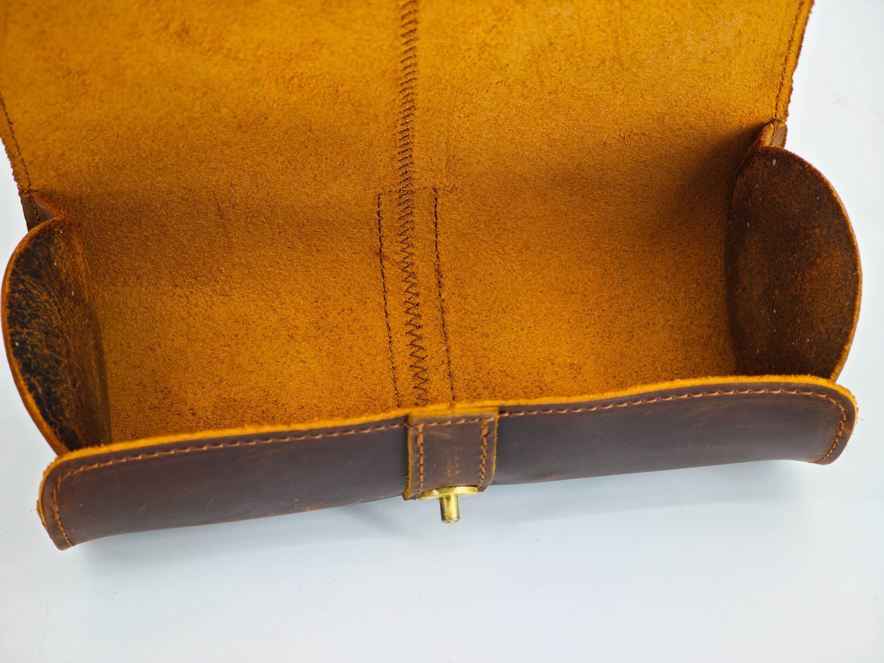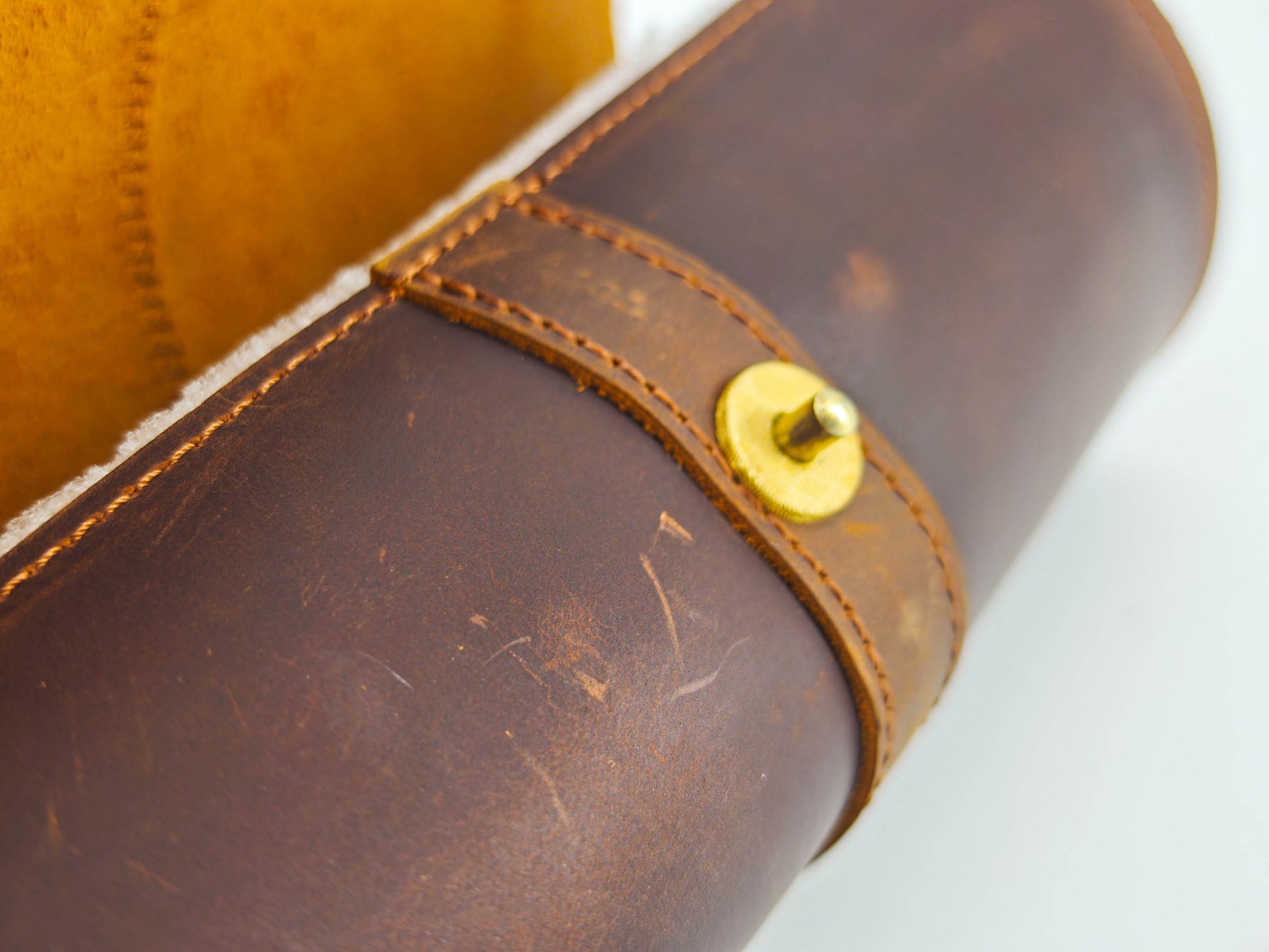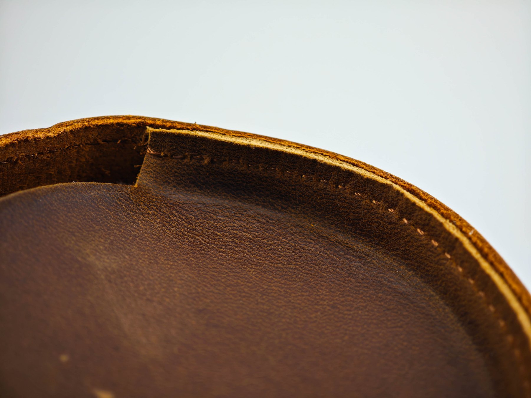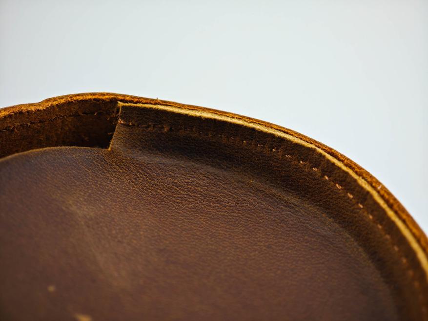 Чехол-футляр сшит из кусочков натуральной кожи, это хорошо видно на торцах кроя. Шов машинный, но в целом производит приятное впечатление. Торцы не обработаны, но все детали ровные. Внутренняя поверхность не обработана — там присутствует мягкая бахтарма натуральной кожи.